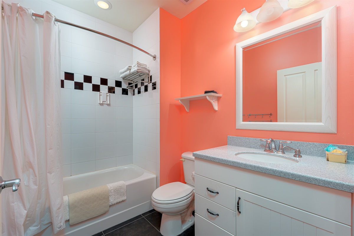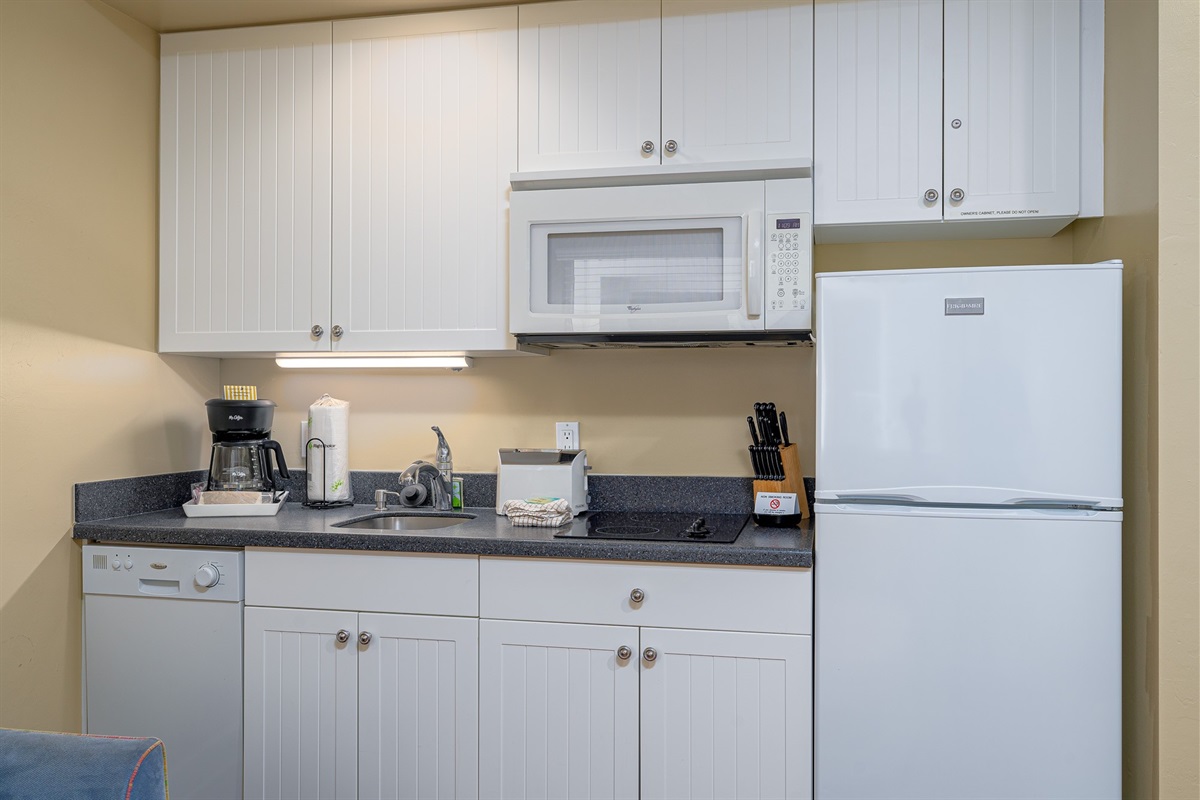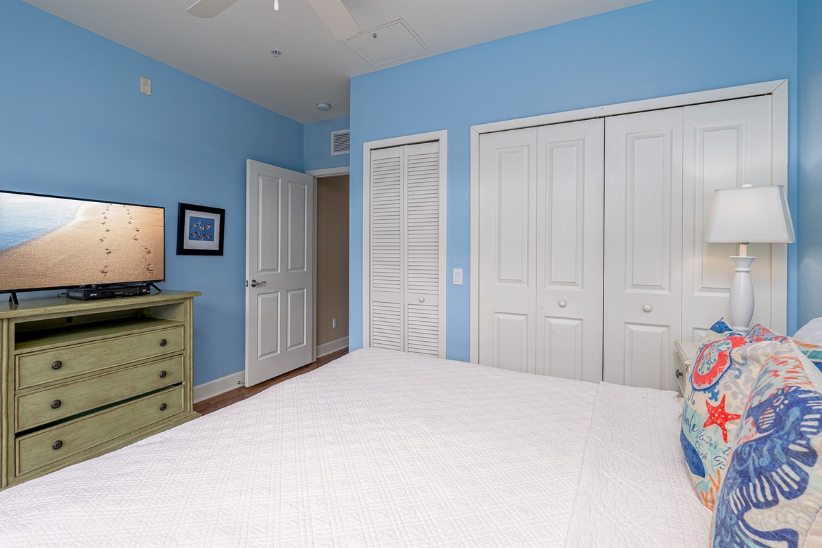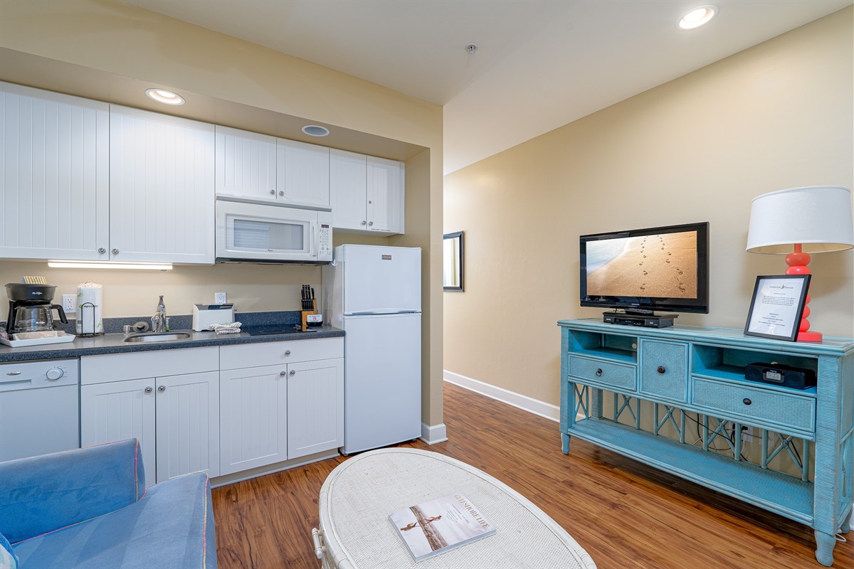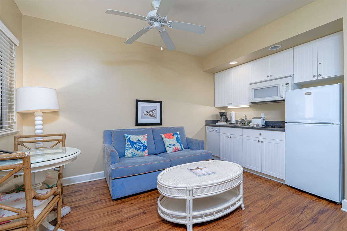 Inside, the unit is designed for comfort and convenience. The spacious bedroom features a king-size bed, creating a restful space to unwind after a day in the sun. The living area includes a sleeper sofa, providing additional sleeping accommodations for guests. A fully equipped kitchen with updated finishes makes it easy to prepare meals or enjoy a quick bite before heading out. The open layout and coastal-inspired décor create a bright, relaxed atmosphere throughout the unit.