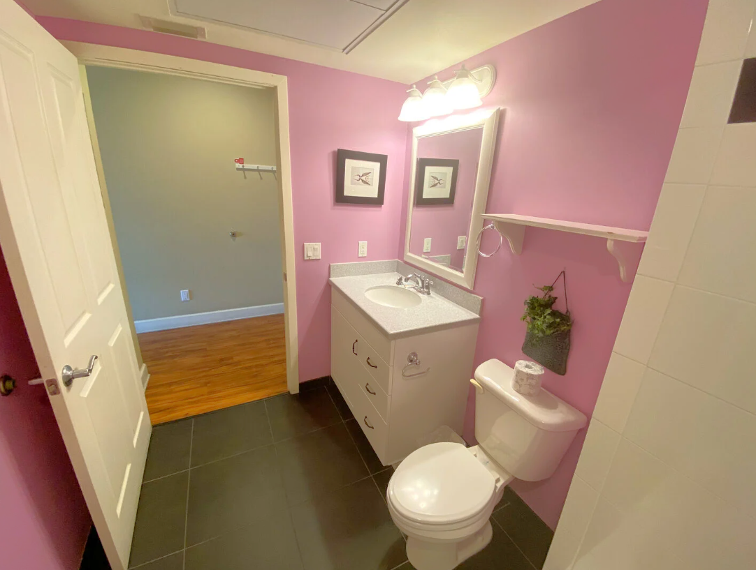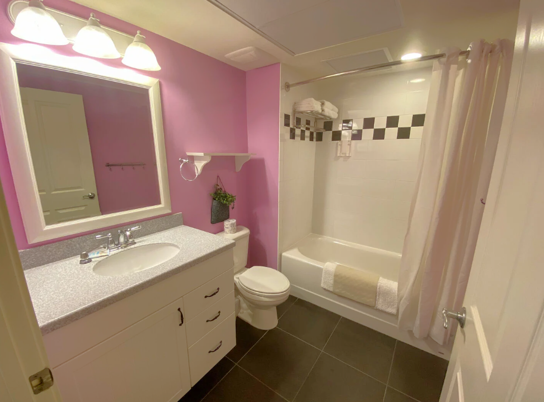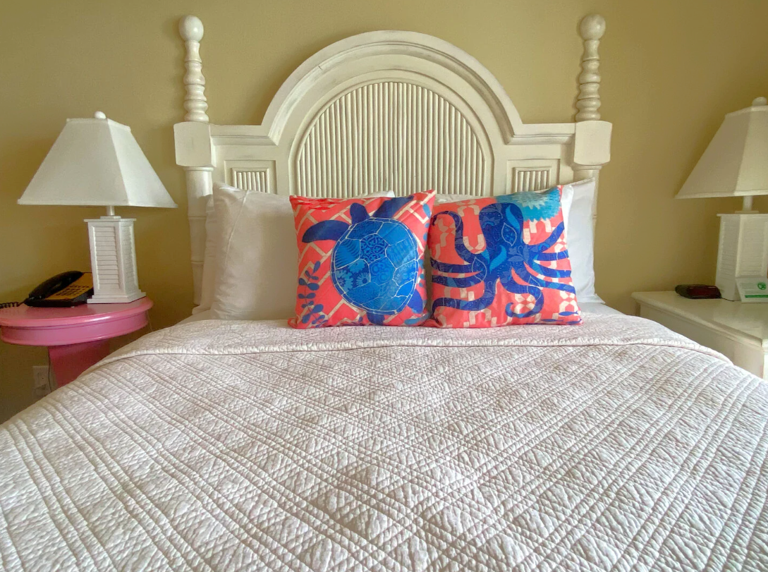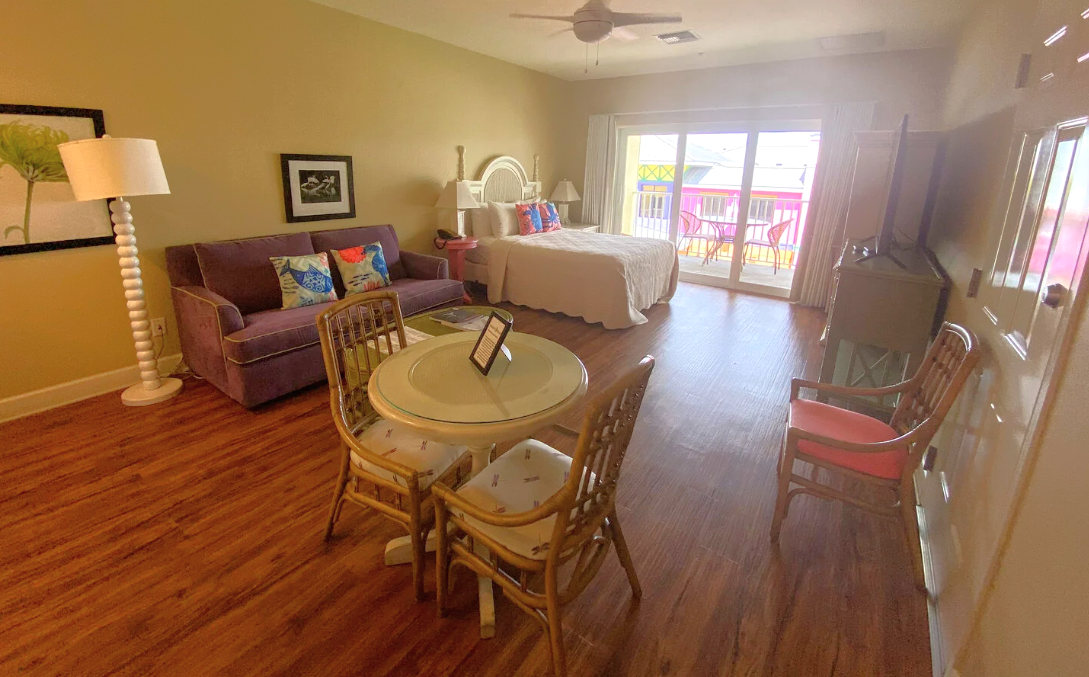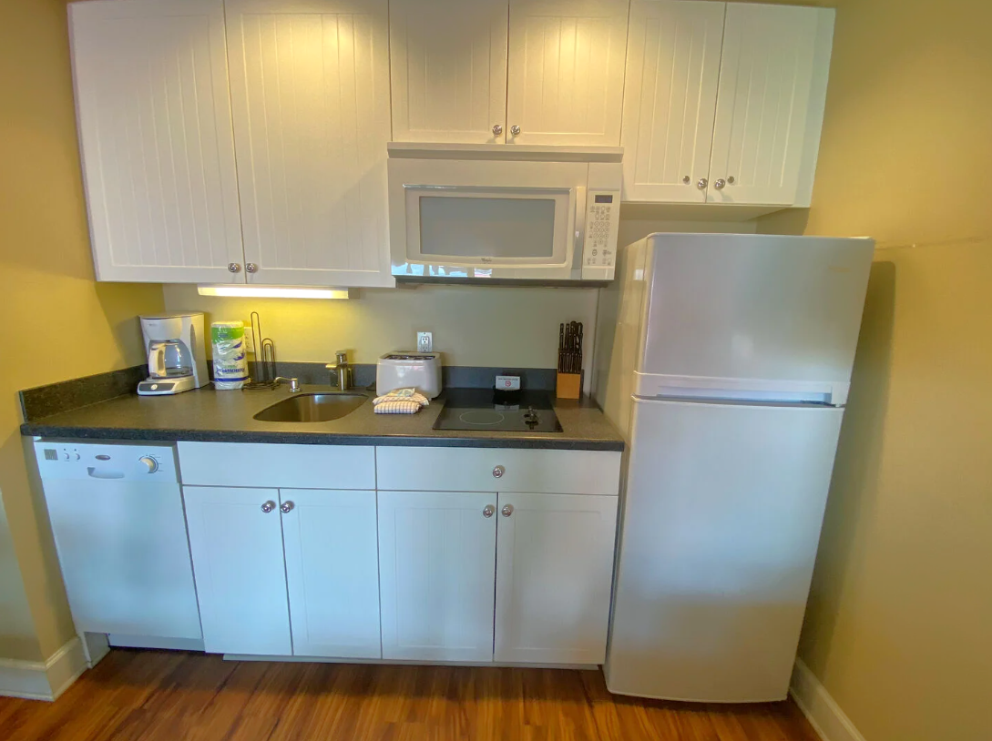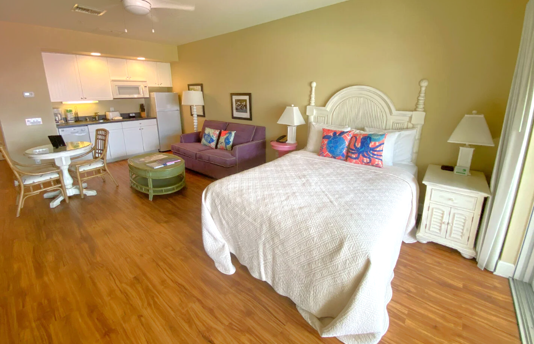 Inside, the studio is thoughtfully designed to maximize space and comfort. The sleeping area features a comfortable queen-size bed, while the living space includes a sleeper sofa, providing flexible accommodations for guests. A well-equipped kitchenette with modern finishes makes it easy to prepare light meals or enjoy your morning coffee before heading out. The open layout, paired with bright coastal décor, creates a relaxed and welcoming atmosphere throughout the unit.