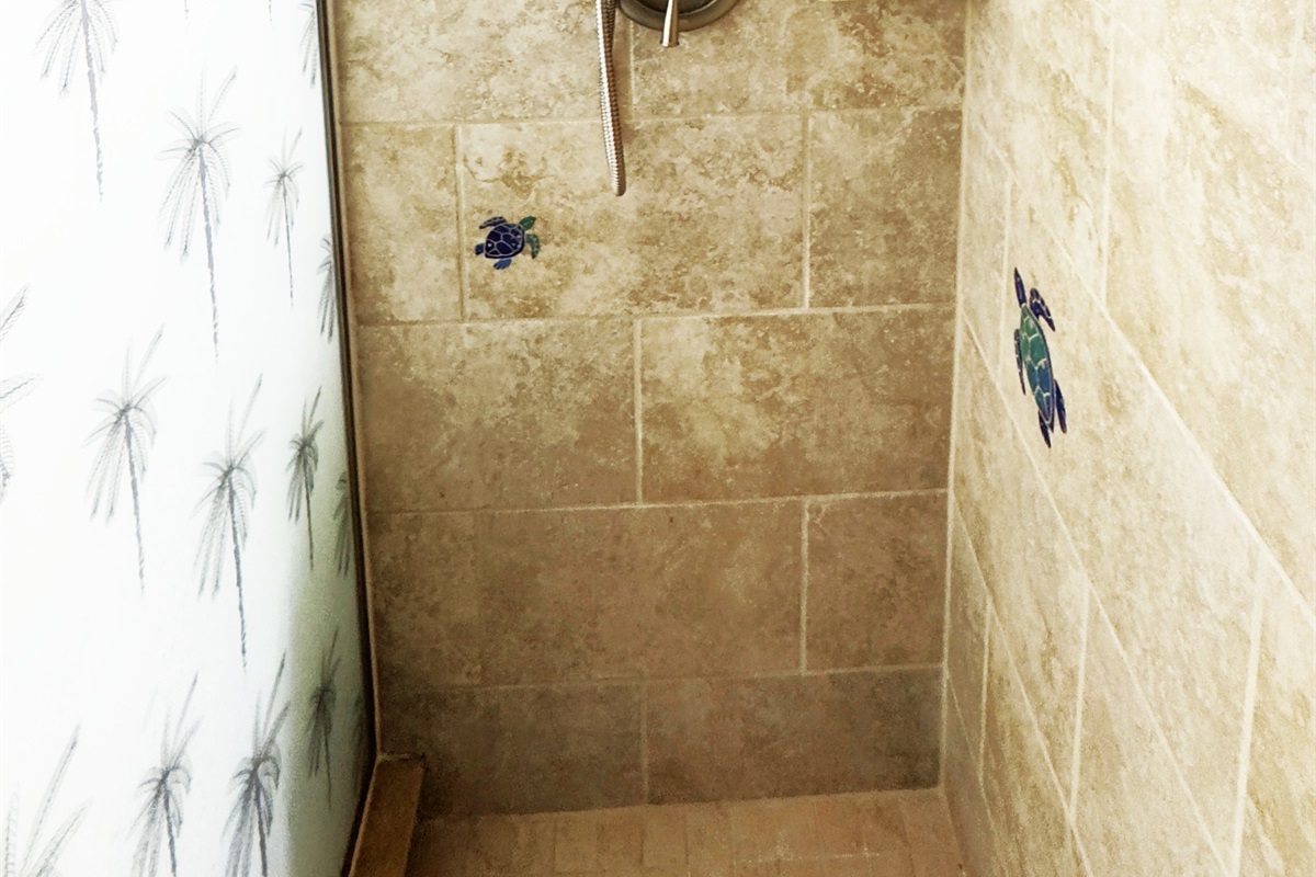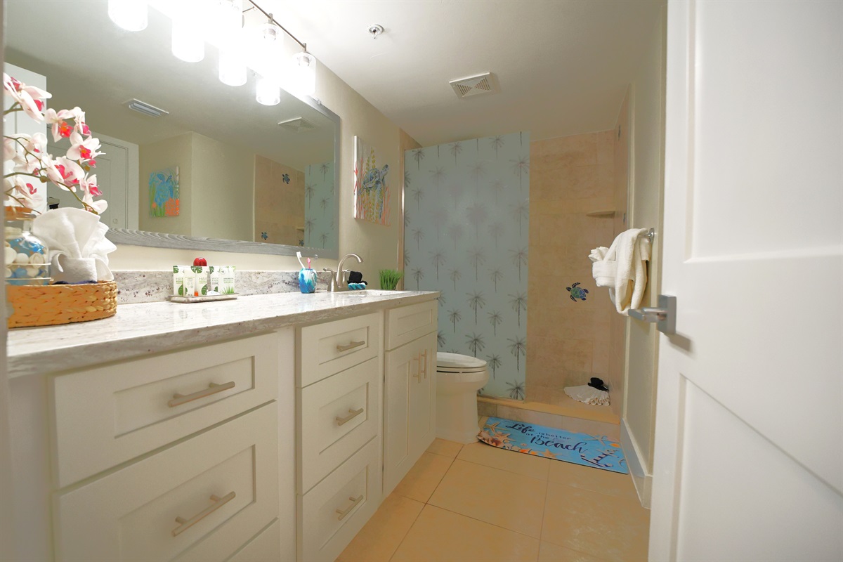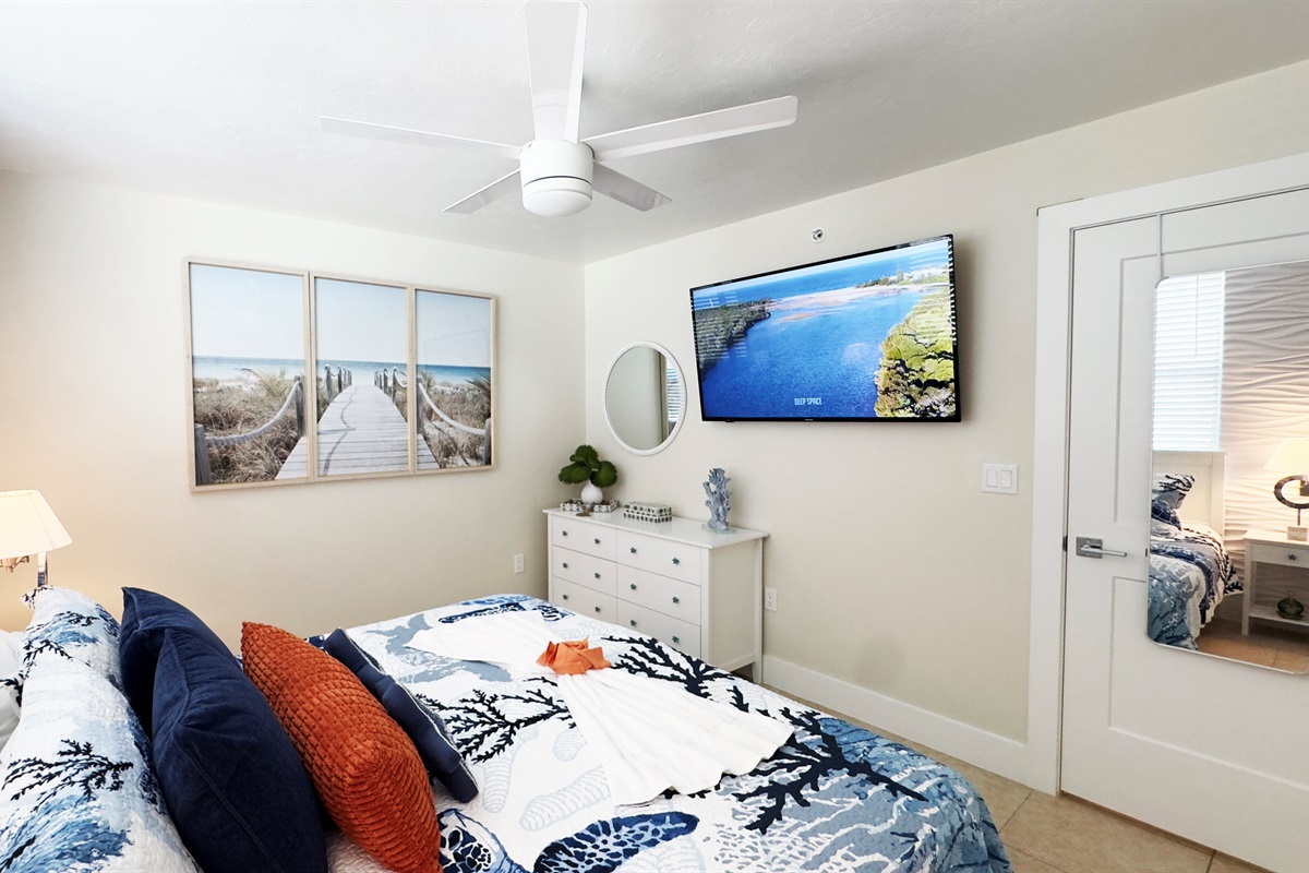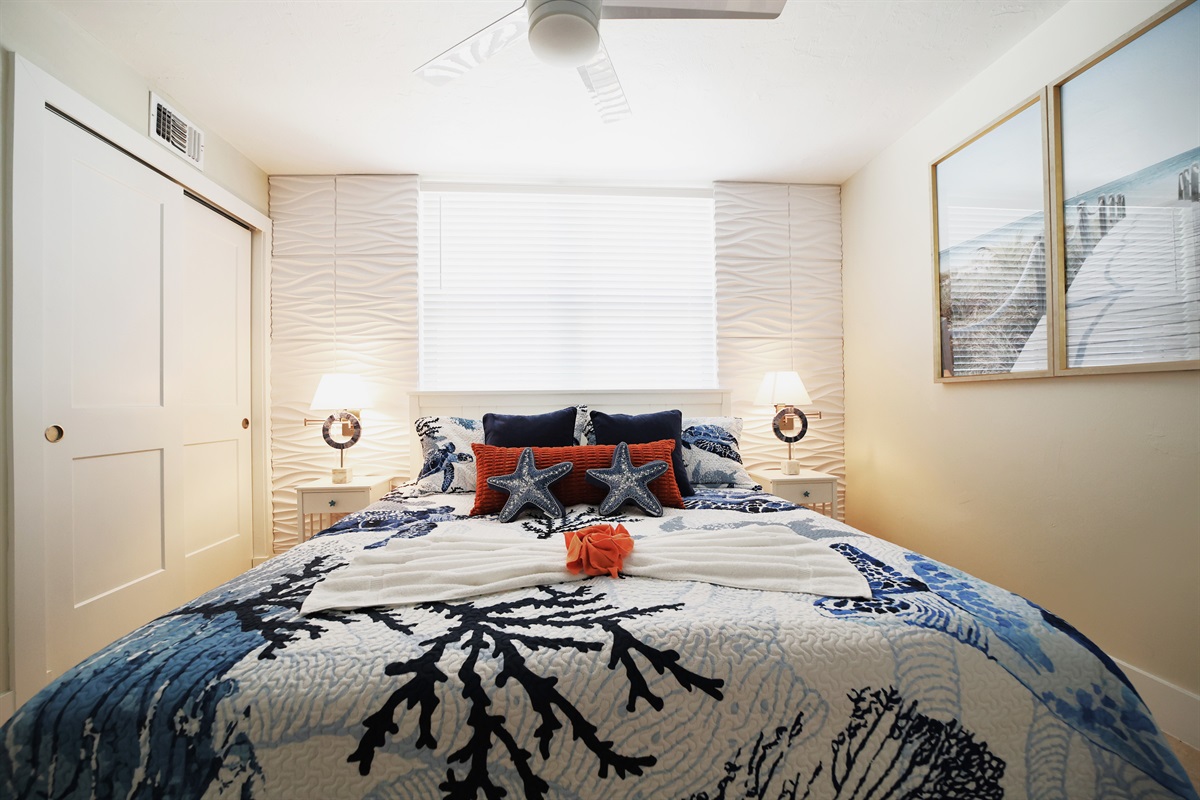 The bedroom offers a comfortable king-sized bed serene retreat with a sea turtle-themed quilt and soft lighting, while the bathroom is beautifully designed with a large walk-in shower, sleek tiles, and plenty of counter space. Thoughtful touches like a nautical-themed decor and convenient layout make this unit a delightful home away from home.