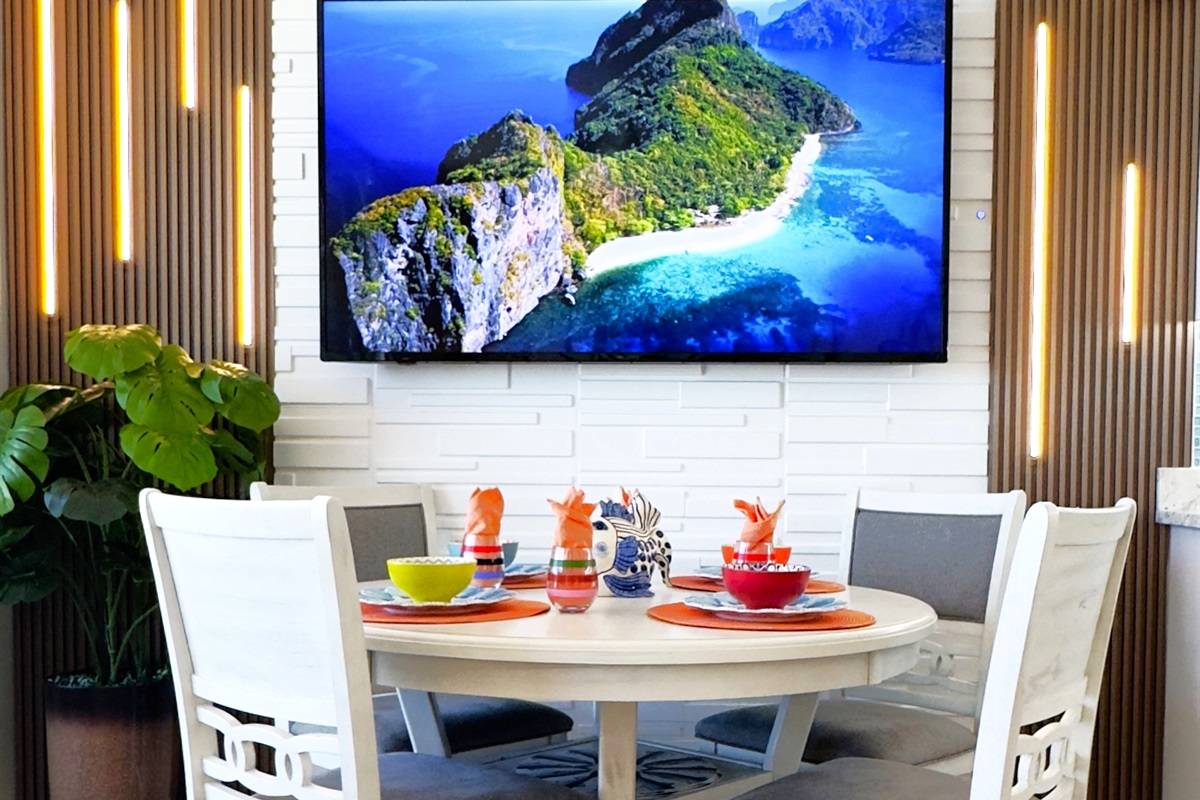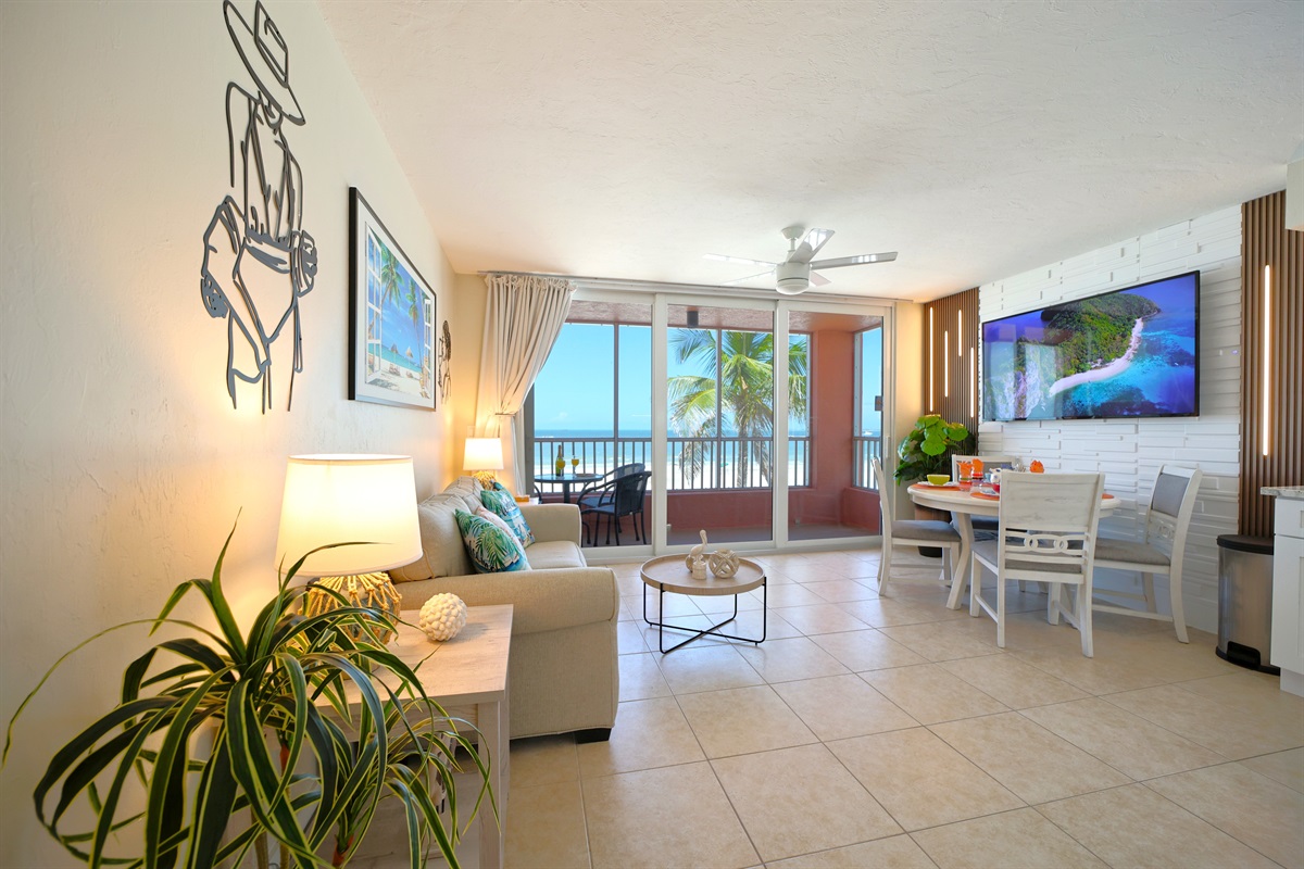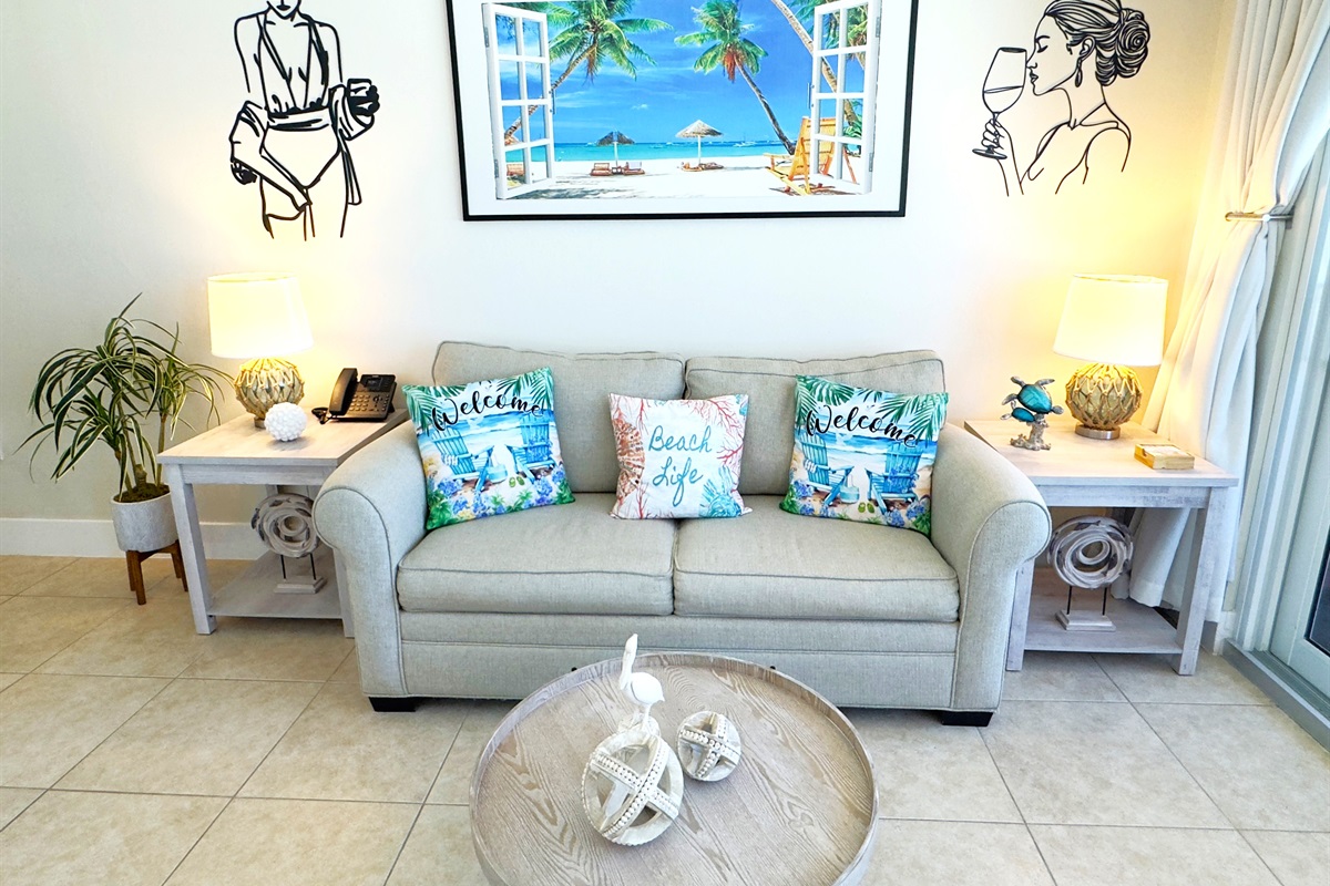 This charming pet friendly beachfront unit is a cozy and modern getaway, perfect for relaxing by the water. The living area features bright, beachy decor, with soft tones of turquoise and sand, making the space feel both welcoming and refreshing. A large flat-screen TV, comfortable sofa, and access to a private balcony overlooking the Gulf of Mexico provide the perfect spot for unwinding after a day at the beach.