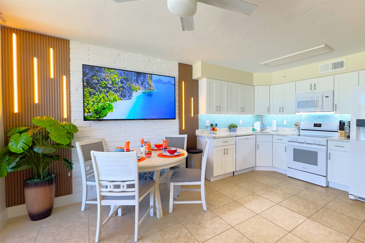 The kitchen is fully equipped with white cabinetry, marble countertops, and a striking aqua backsplash that adds a coastal touch. It includes all the essentials, such as a dishwasher, refrigerator, stove, and microwave, making it easy to prepare meals or snacks. The dining area, positioned near the balcony, allows you to enjoy meals while soaking in the ocean views.