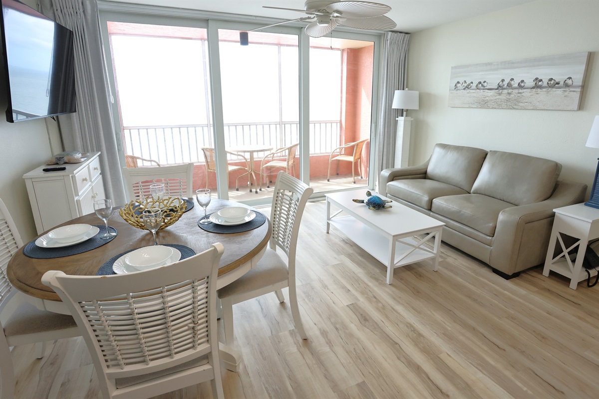 This elegant beachfront unit offers the perfect blend of comfort and style, with breathtaking views of the Gulf of Mexico. The living area features a sleek leather sofa, a coastal-inspired coffee table, and a dining table set for four, making it ideal for relaxing or enjoying meals with family. Floor-to-ceiling windows and sliding doors lead to a private balcony, where you can soak in the ocean breeze and enjoy the stunning sunset views.