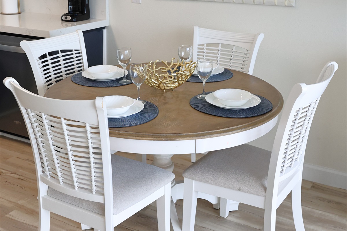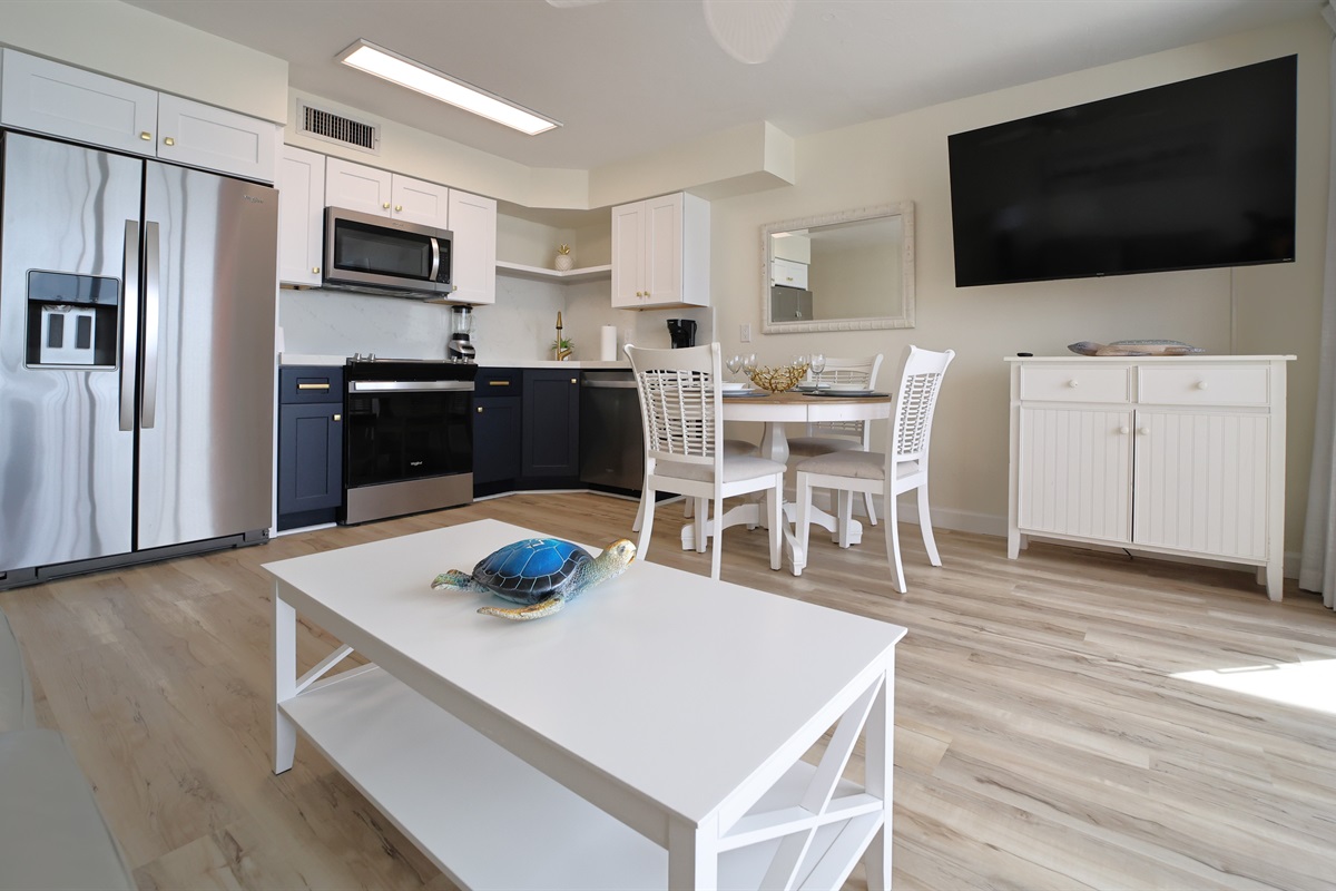 The kitchen is a true standout, with modern stainless-steel appliances, a chic two-tone design featuring navy blue and white cabinetry, and polished countertops. It’s fully equipped with everything you need, whether you want to prepare a gourmet meal or just a quick snack. The open layout flows seamlessly into the dining and living spaces, creating a bright and welcoming atmosphere.