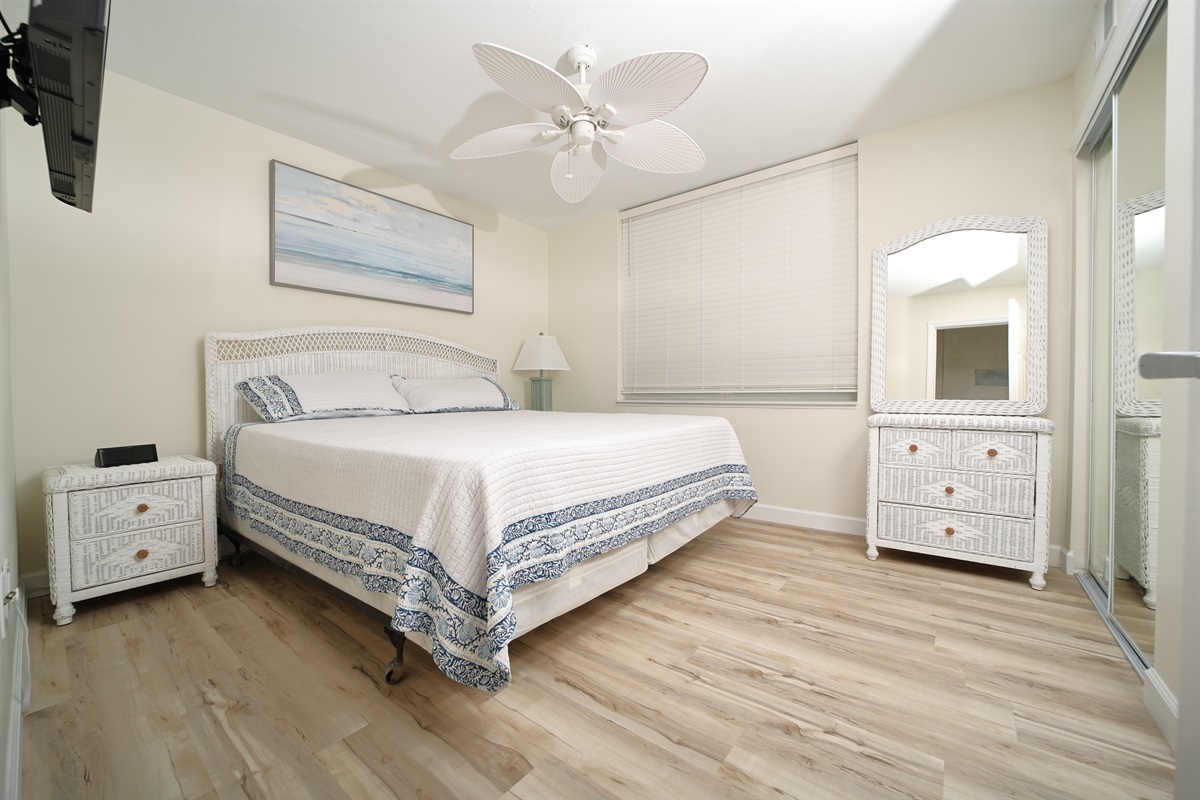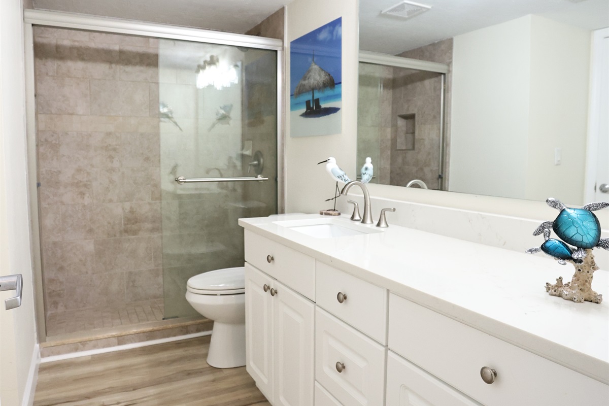 The bathroom is both stylish and functional, featuring a walk-in glass shower with elegant tiling and a spacious vanity with ample counter space. Thoughtful touches like the nautical decor and soft, natural wood-style flooring throughout the unit give it a beachy charm. Whether you’re here for a weekend escape or a longer stay, this beachfront unit provides a serene and luxurious retreat.