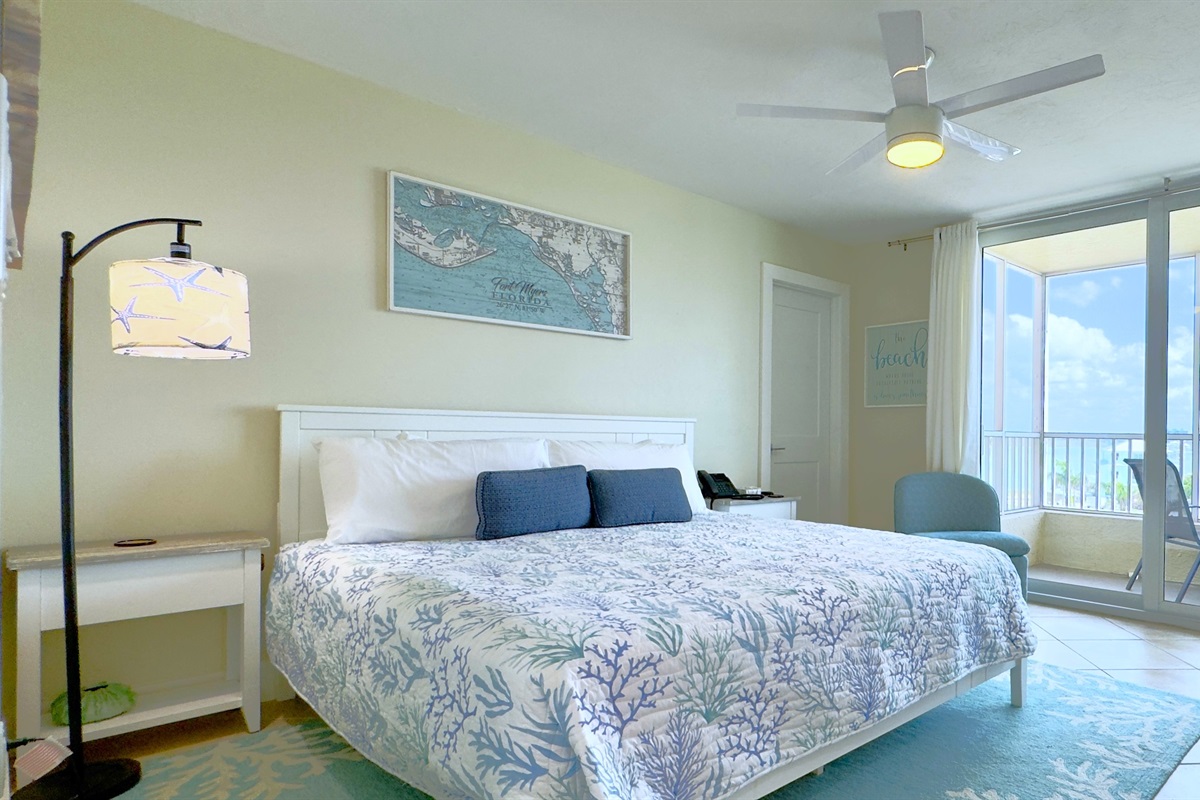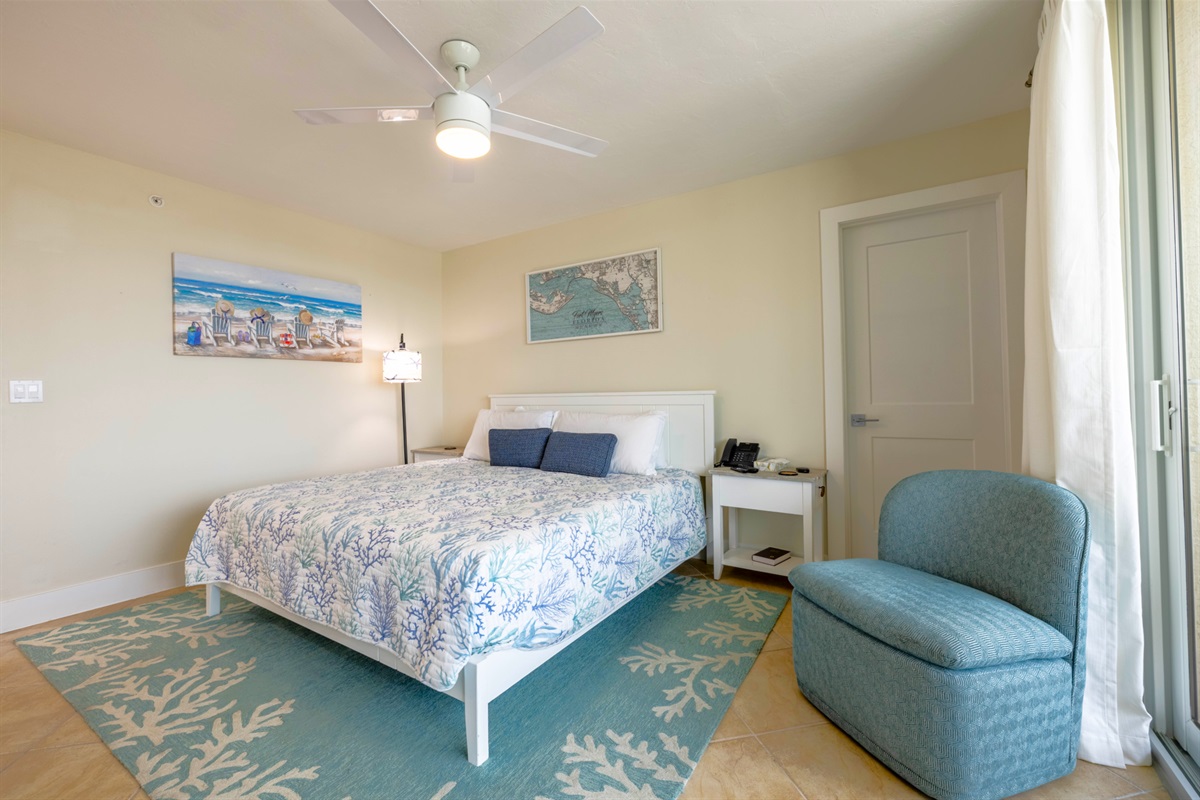 This cozy bayfront designer studio unit offers a serene retreat with beautiful views and modern amenities. The spacious bedroom features a comfortable king-sized bed adorned with soft, coastal-themed linens and a private balcony where you can enjoy a morning coffee while taking in the bay views. The room is light and airy, with natural light streaming through the large sliding glass doors.