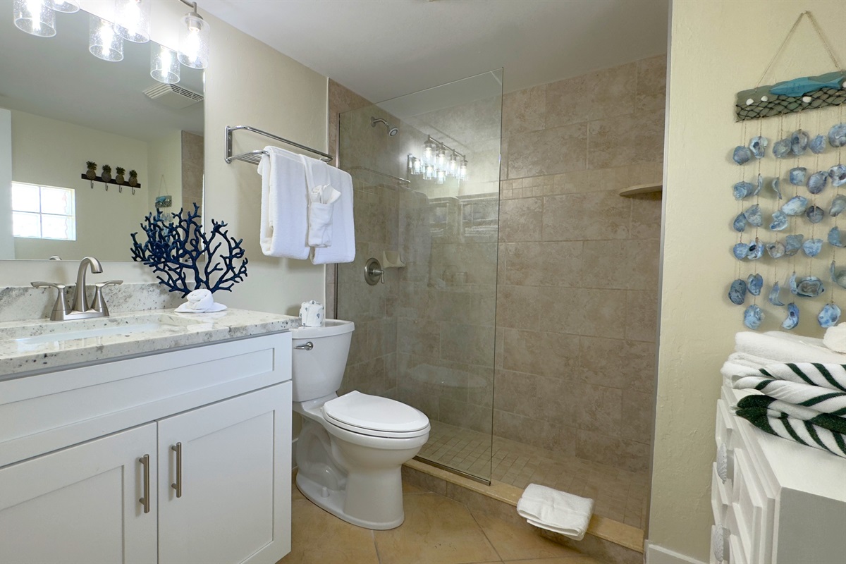 The bathroom is thoughtfully designed, featuring a spacious walk-in shower with neutral tiling and a modern vanity with ample counter space. The bayfront balcony is the highlight of this unit, offering a relaxing outdoor space to unwind while enjoying the peaceful surroundings. Ideal for couples or solo travelers, this bayfront unit combines simplicity and comfort, making it the perfect spot for a relaxing getaway.