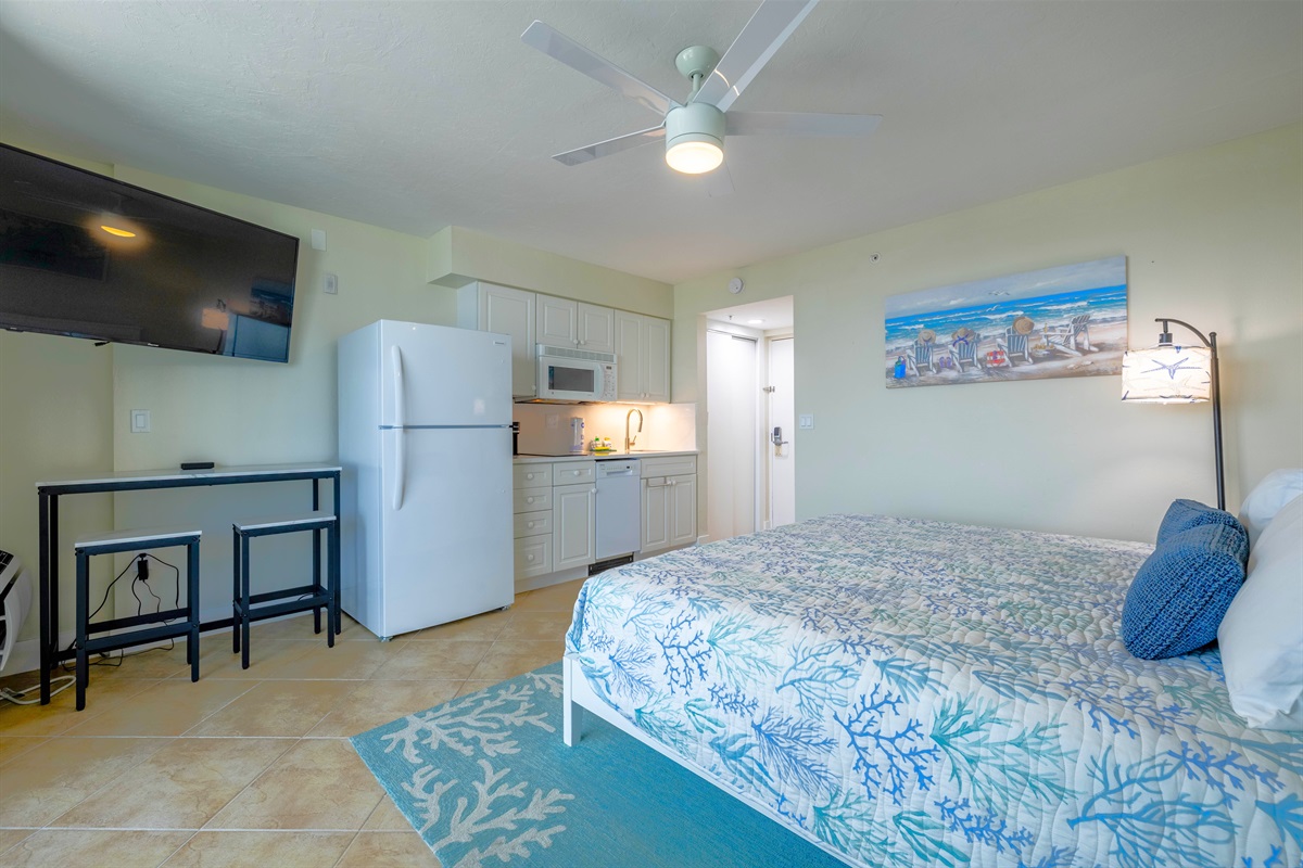 The kitchenette is compact yet well-equipped, featuring white cabinetry, a full-sized refrigerator, microwave, dishwasher, and a small dining area for two. Perfect for preparing light meals or snacks, it offers everything you need for a comfortable stay. The open-plan design ensures a seamless flow between the sleeping, dining, and living spaces, making the unit feel welcoming and functional.