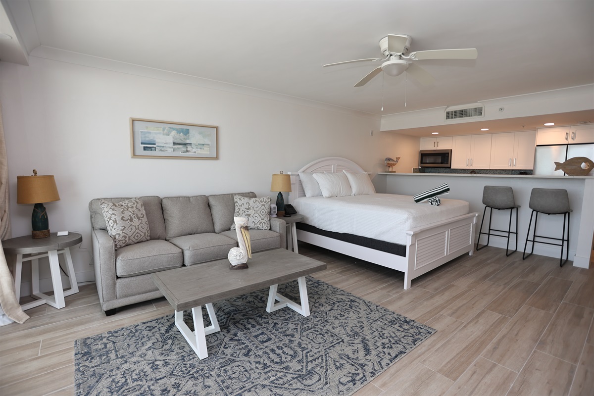 This elegant King Suite Gulf Front unit offers a luxurious and relaxing beachfront experience. The spacious suite is beautifully designed with coastal-inspired decor, featuring a plush king-sized bed adorned with crisp white linens. The open-plan layout seamlessly connects the sleeping, living, and dining areas, providing a cozy yet upscale atmosphere. Large sliding glass doors lead to a private balcony where you can take in breathtaking views of the Gulf of Mexico, perfect for enjoying the sunrise or sunset.