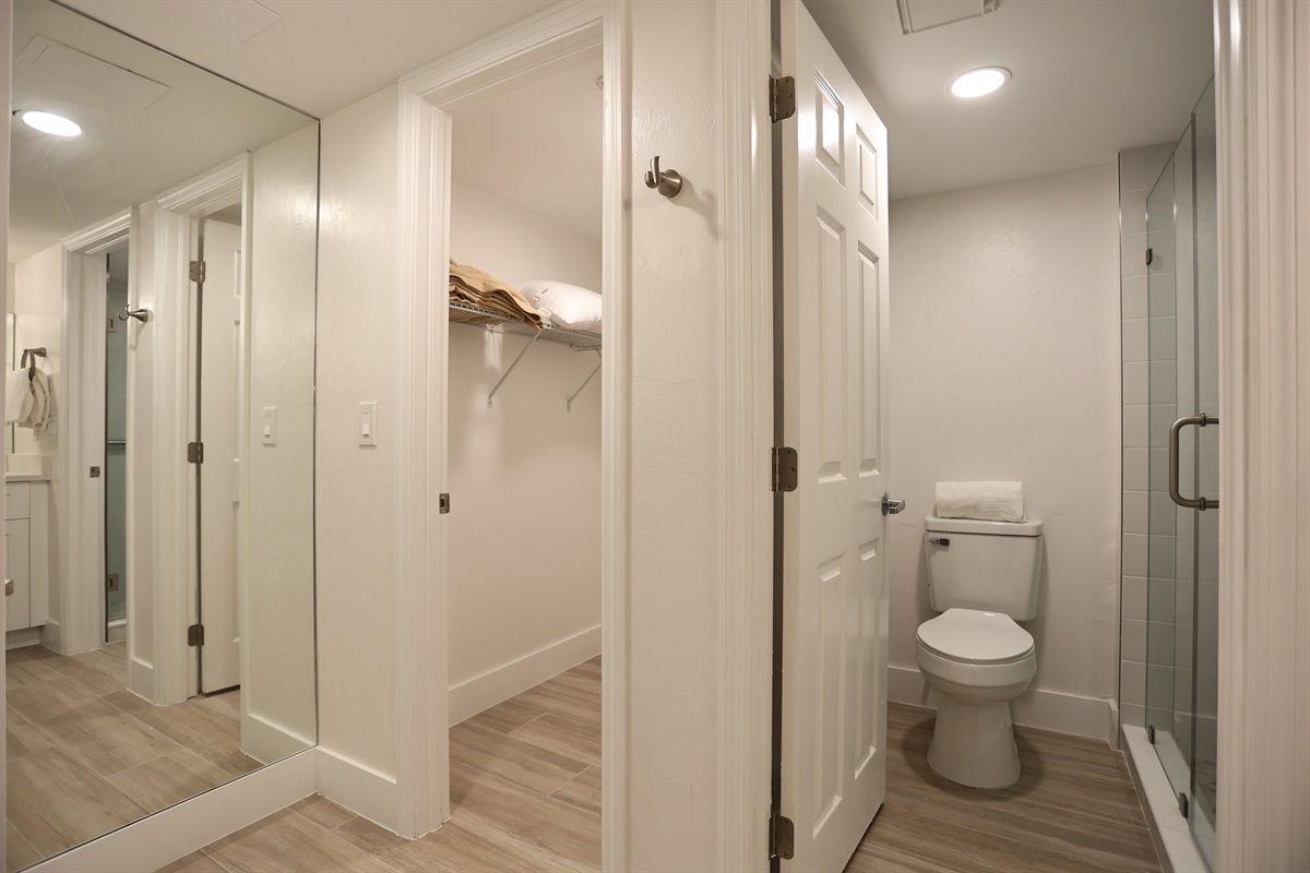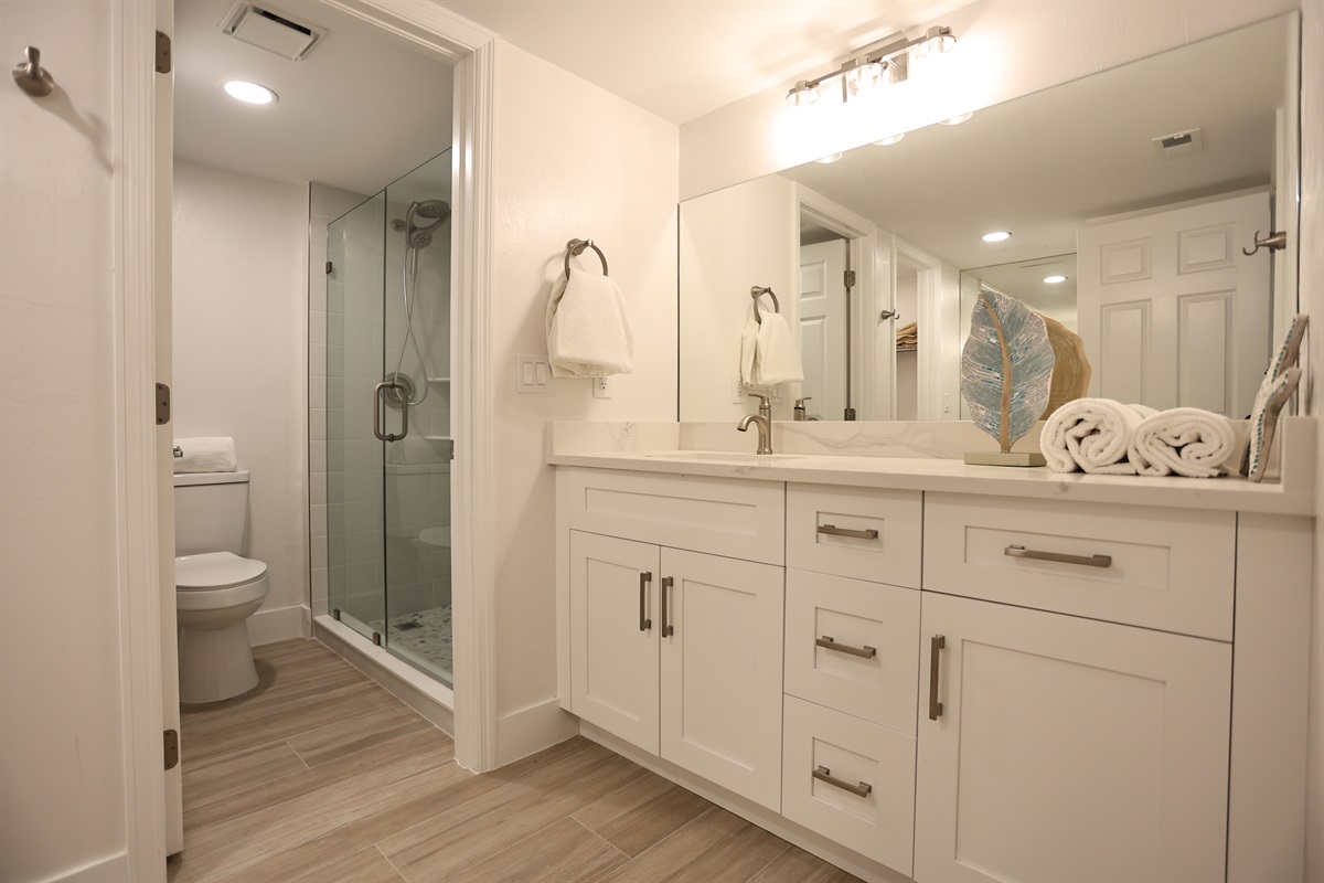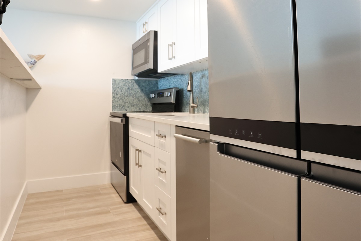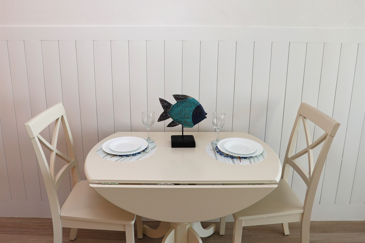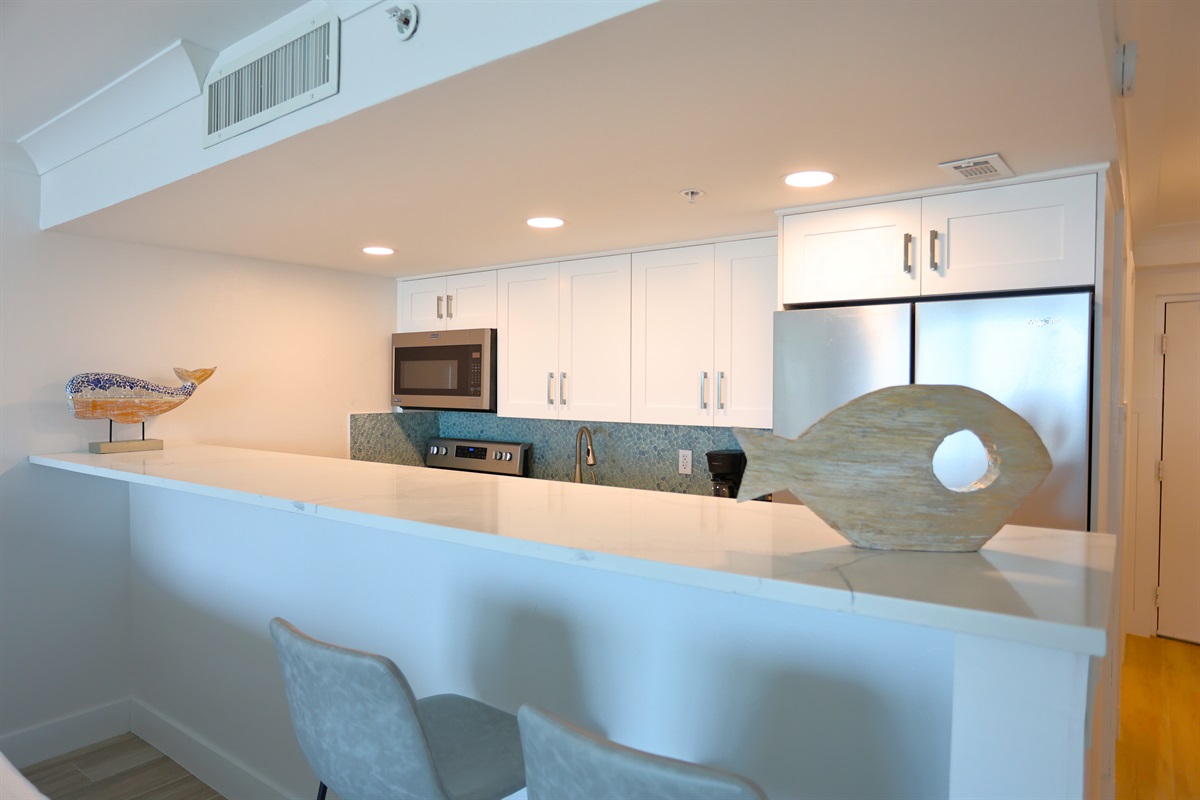 The kitchen is modern and fully equipped, featuring sleek stainless steel appliances, white cabinetry, and a chic blue backsplash that adds a pop of coastal charm. A breakfast bar with high-top stools offers a casual spot for dining or enjoying a quick coffee. Adjacent to the kitchen, a small dining area with a charming table and chairs adds additional functionality while maintaining the unit's stylish design.