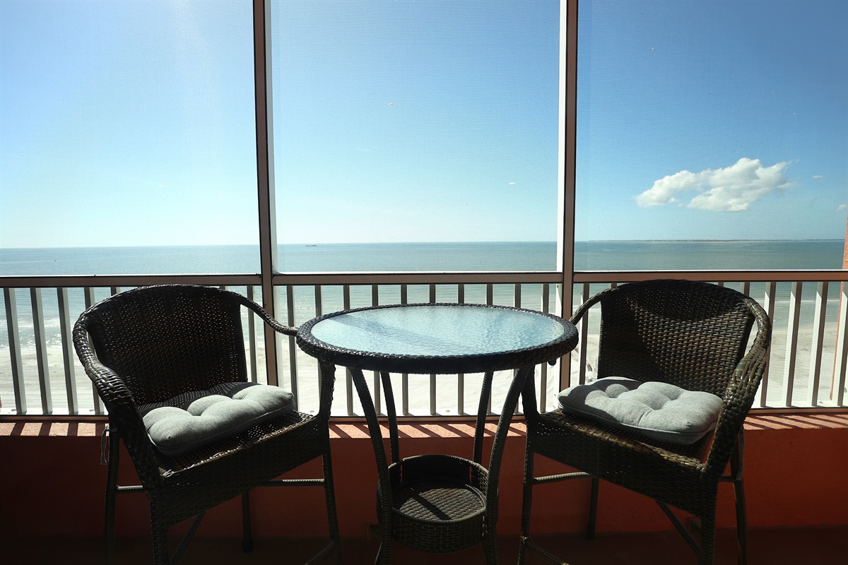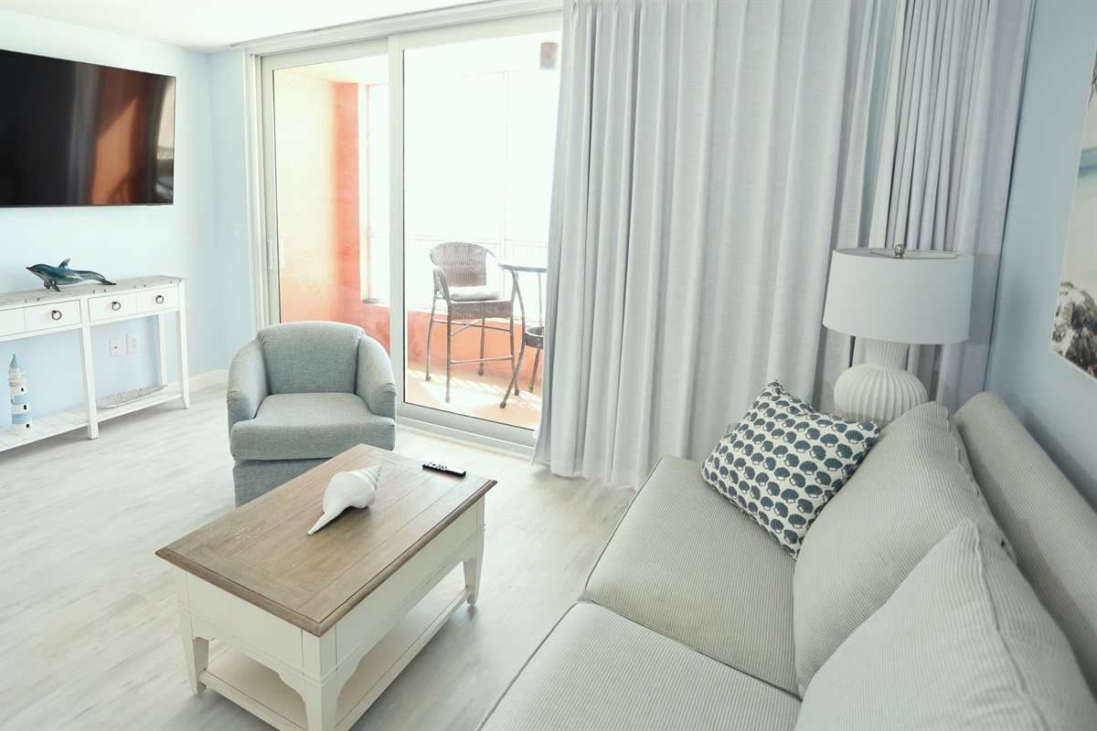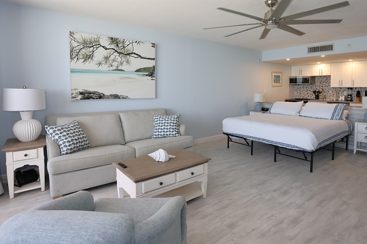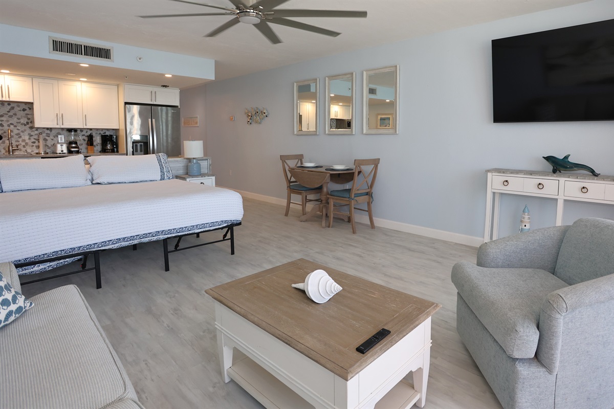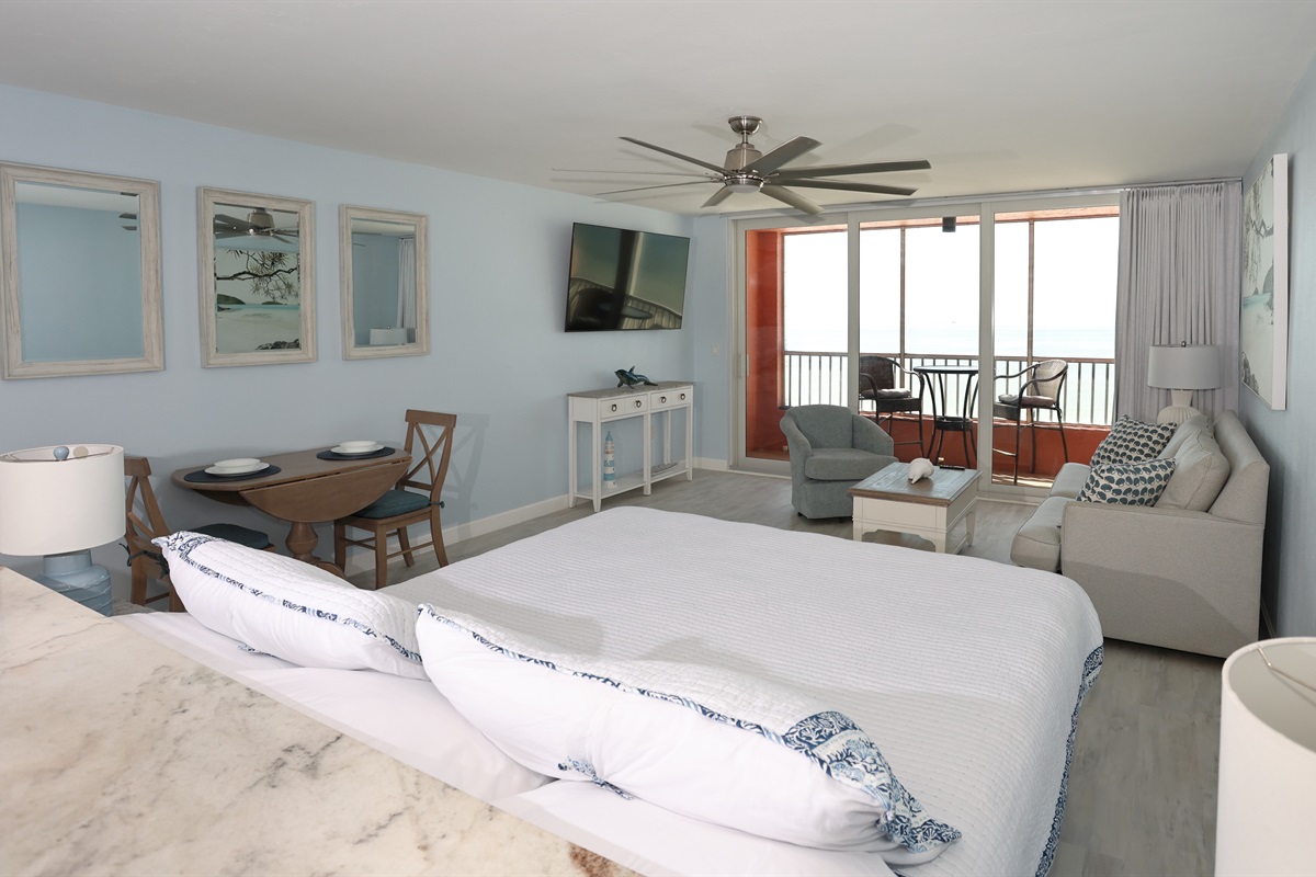 This beautifully renovated beachfront unit offers a modern and tranquil escape with stunning views of the Gulf of Mexico. The open-concept layout features elegant coastal decor, highlighted by soft blue walls, stylish furnishings, and contemporary finishes. A comfortable sofa and armchair provide a cozy seating area, while the plush king-sized bed invites relaxation after a day by the beach. The private balcony, accessible through sliding glass doors, offers breathtaking views and the perfect spot for enjoying a morning coffee or sunset cocktails.