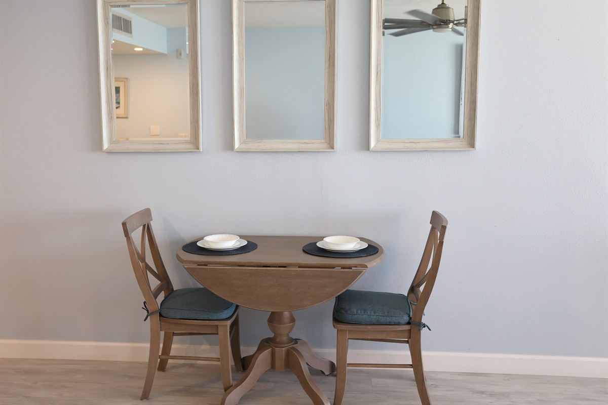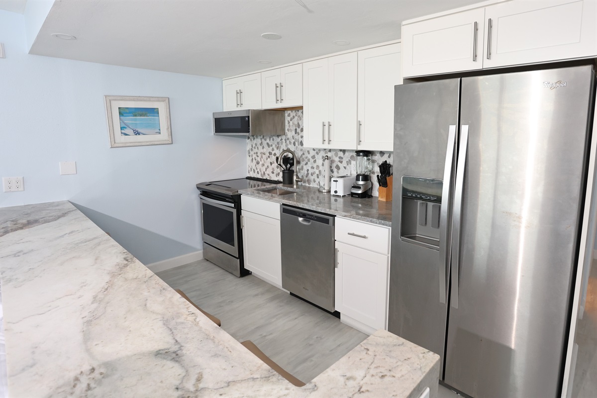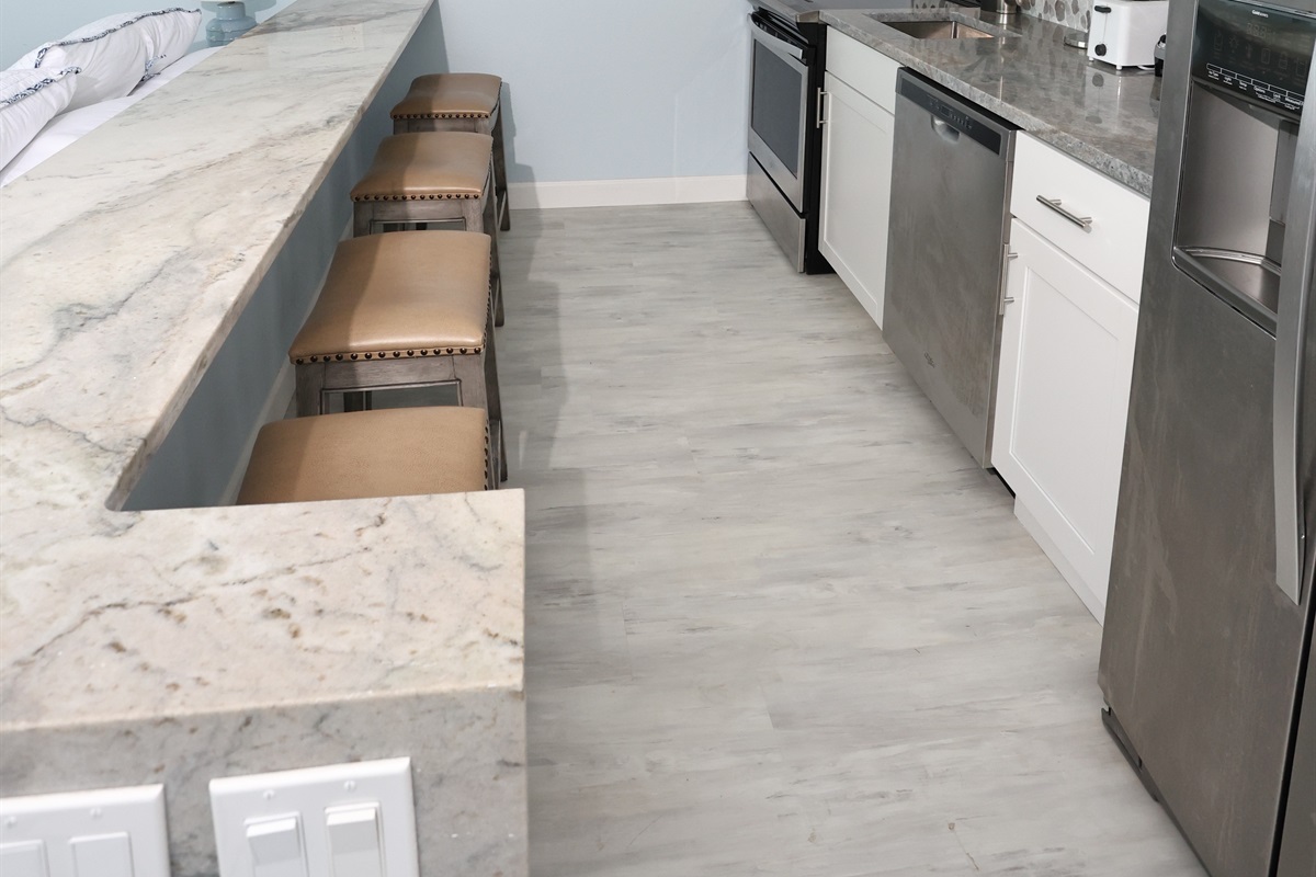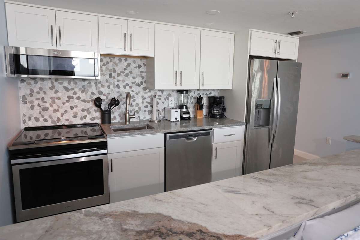The unit boasts a sleek and fully equipped kitchen with stainless steel appliances, marble countertops, and a chic mosaic backsplash. Whether preparing a full meal or a quick snack, this kitchen is as functional as it is stylish. The adjacent dining area features a charming table set for two, ideal for intimate meals or enjoying takeout from one of the many nearby restaurants. A large flat-screen TV and ceiling fan add to the unit's comfort and convenience.