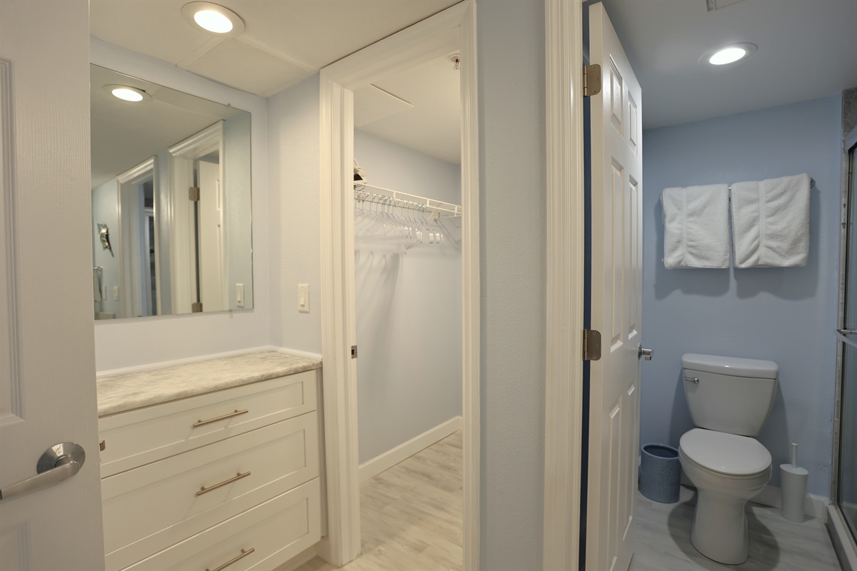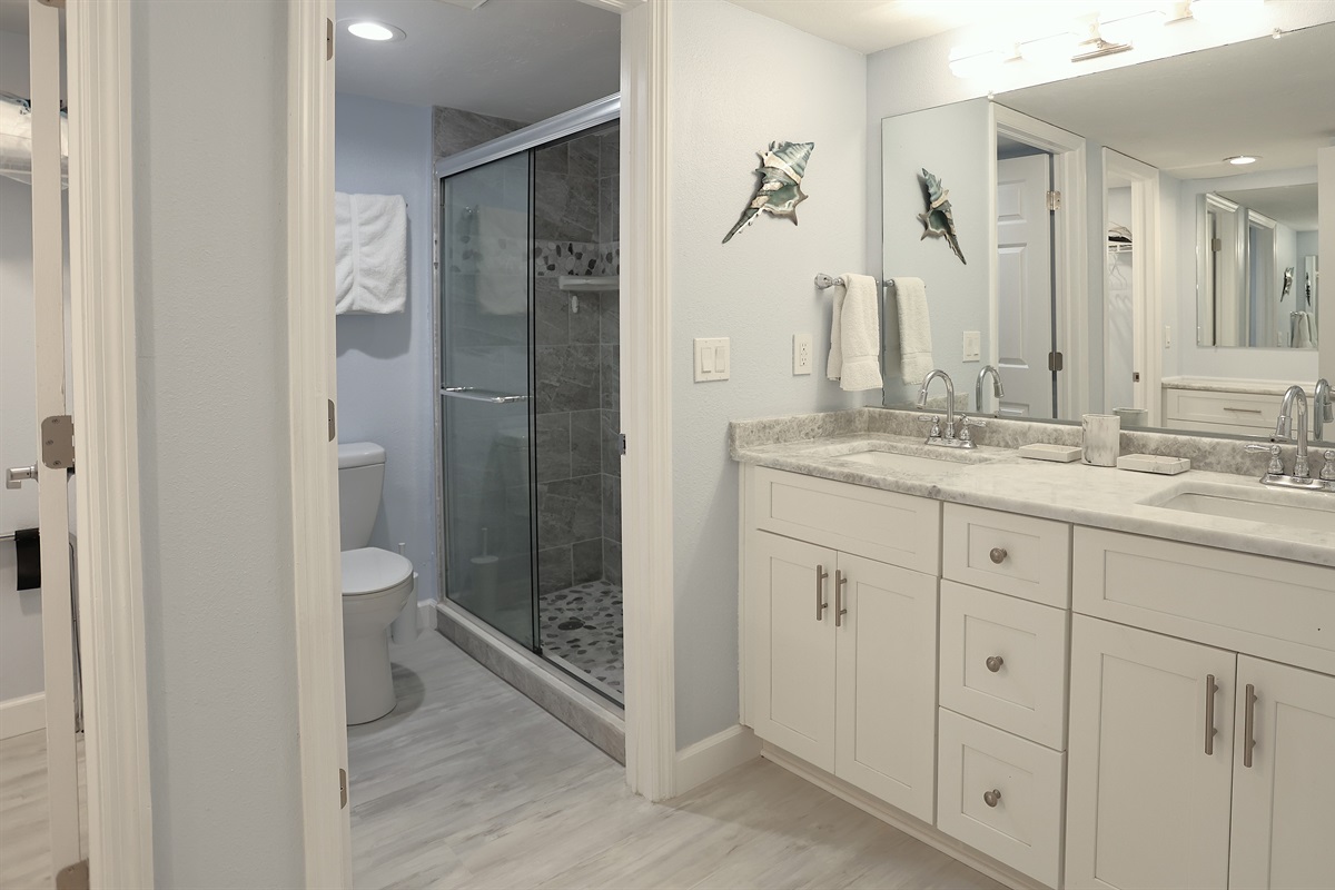 The spa-like bathroom is designed for relaxation and practicality, with a glass-enclosed walk-in shower featuring modern tile work and a dual-sink vanity with ample counter and storage space. Additional amenities include an in-unit washer and dryer and thoughtfully curated decor, creating a space that feels like a true beachfront sanctuary. Located in the heart of Fort Myers Beach, this unit provides easy access to local attractions, dining, and entertainment, making it an ideal getaway for couples or solo travelers seeking a luxurious and serene retreat.