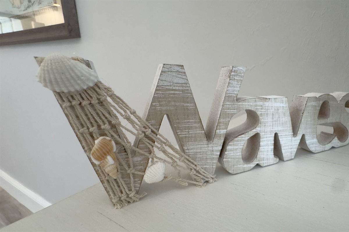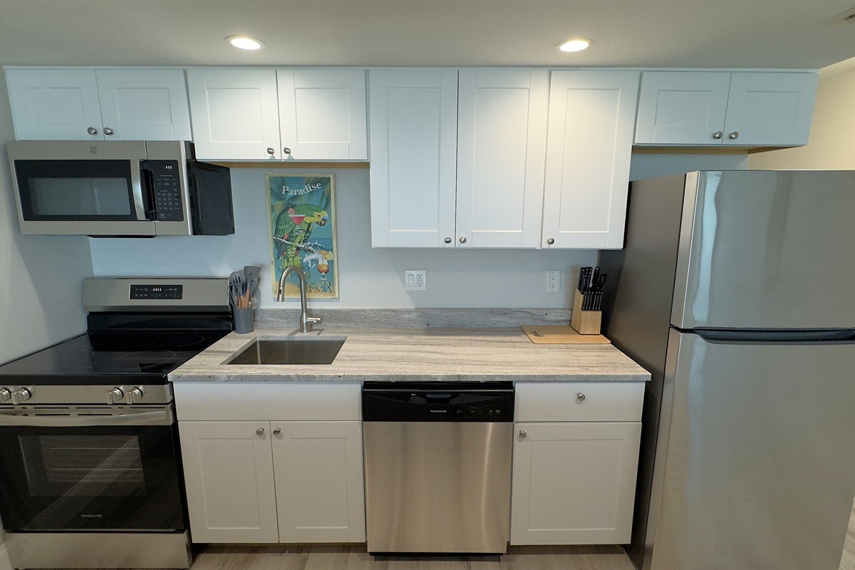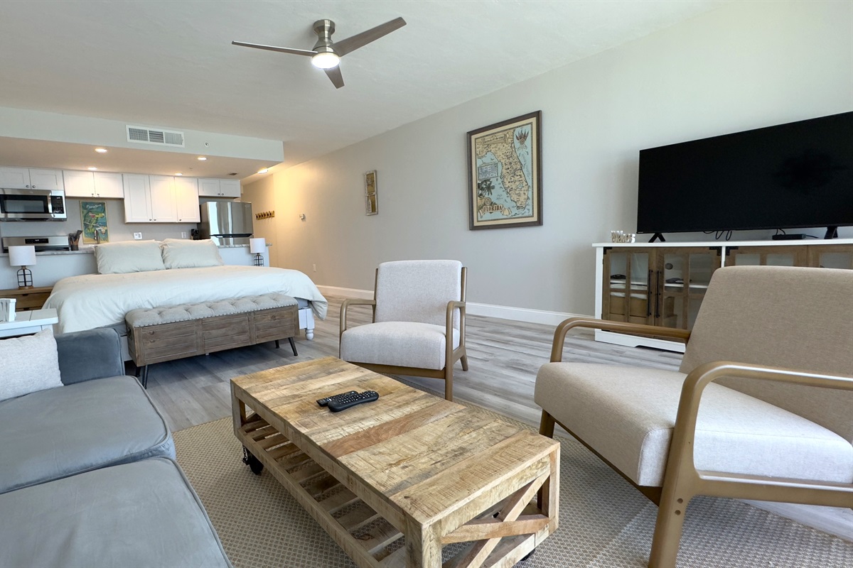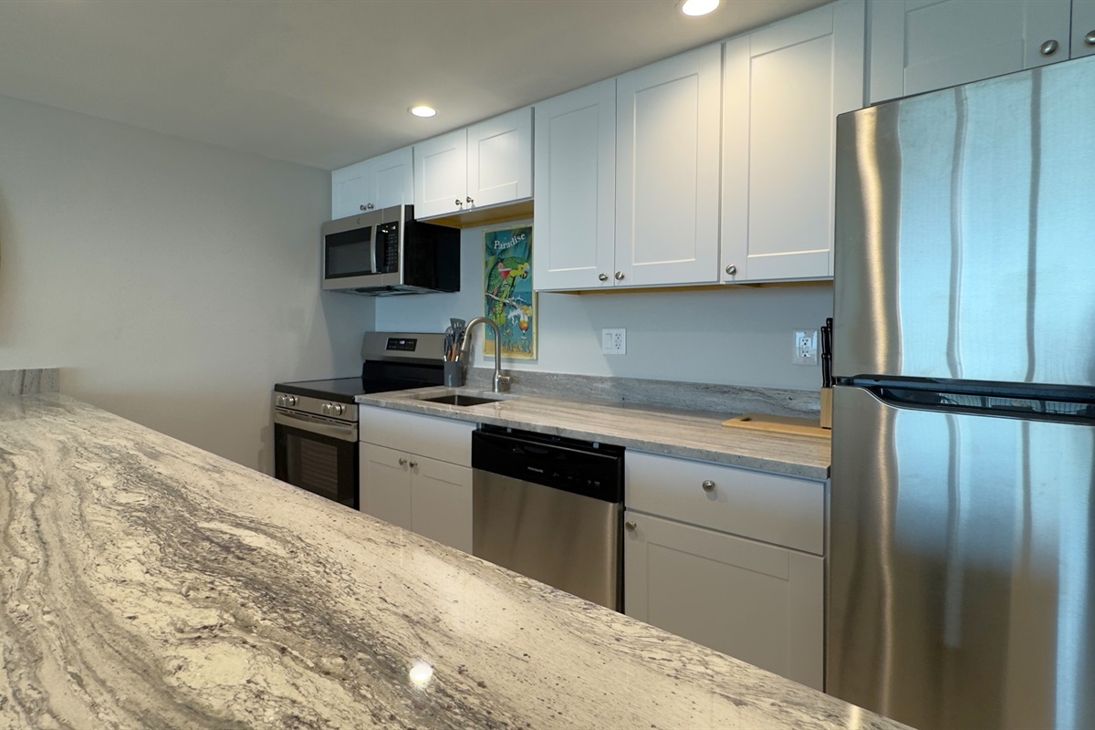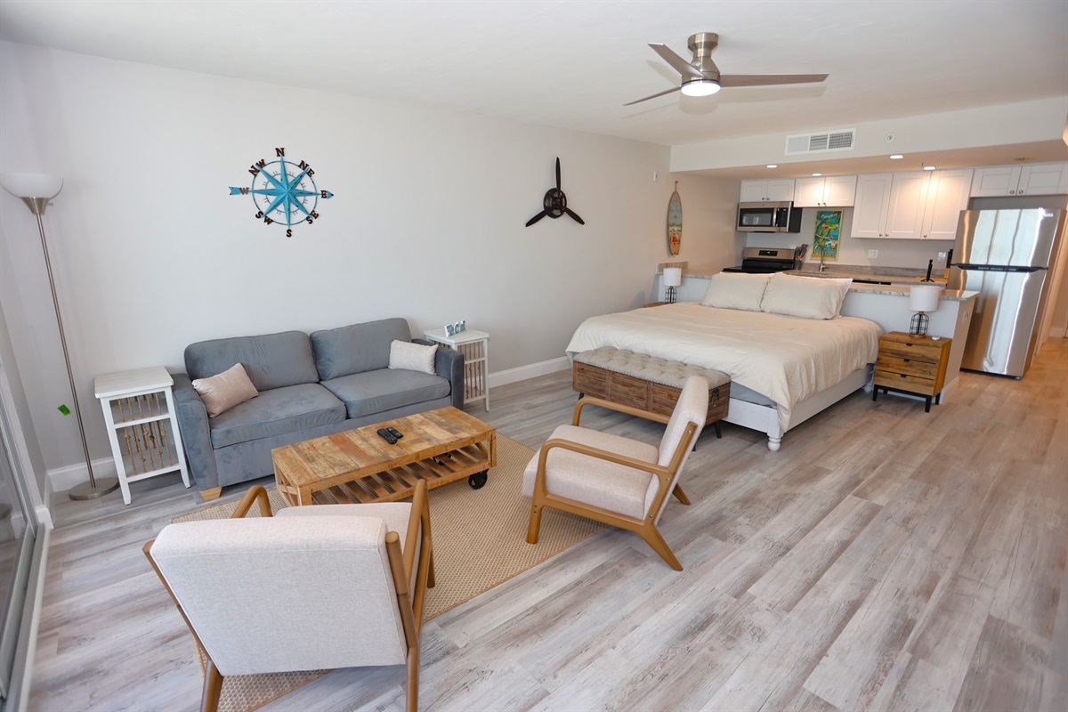The fully equipped kitchen is a standout feature, with sleek stainless steel appliances, marble-style countertops, and pristine white cabinetry. A cozy breakfast bar and dining nook offer inviting spaces to enjoy meals or snacks. The open-concept living area includes a comfortable sofa and stylish armchairs, perfect for lounging after a day of beach activities. Nautical accents and thoughtfully curated artwork enhance the unit’s relaxing, seaside ambiance.