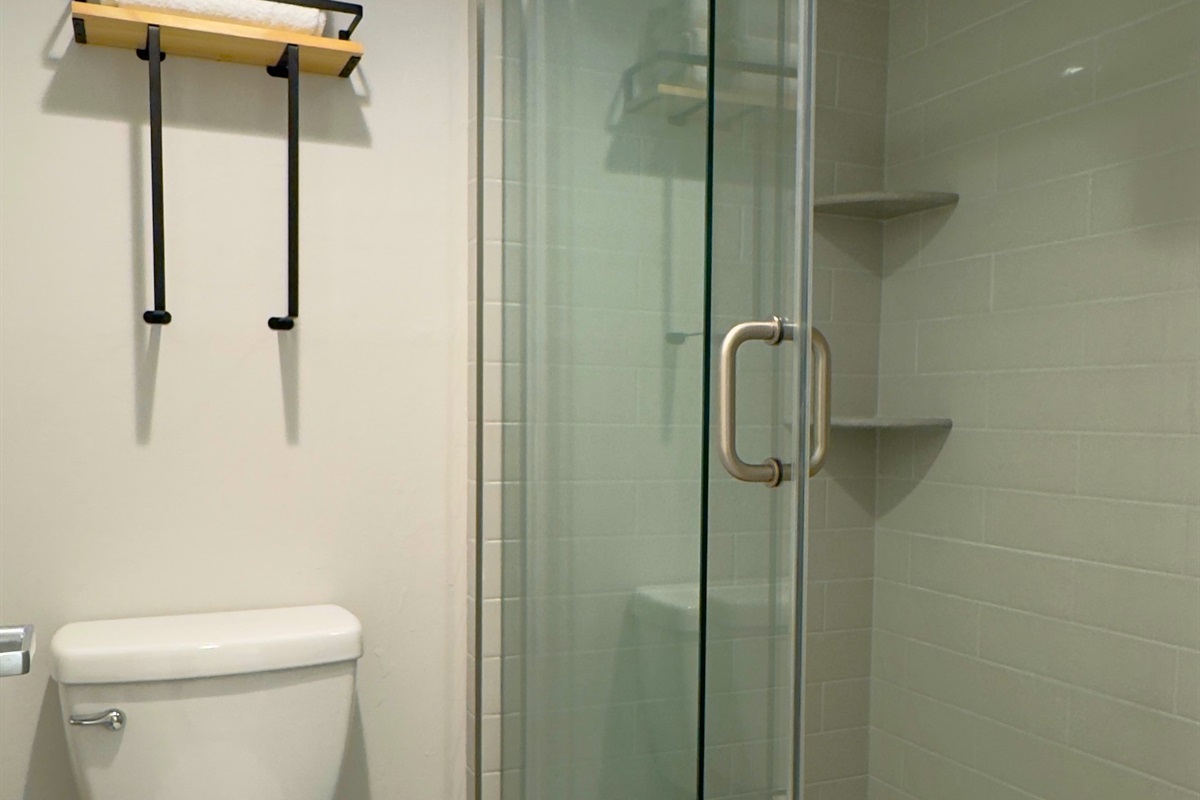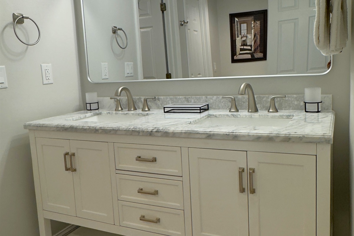The spa-like bathroom is designed for comfort and convenience, featuring a spacious walk-in shower with modern tilework and pebble flooring. A dressing area with ample storage adds practicality to the suite. Whether you're seeking a romantic getaway or a peaceful solo retreat, this Gulf Front King Suite combines comfort, elegance, and stunning views to create an unforgettable beachfront experience. Onsite management provided by #1 rated: Fort Myers Beach Vacation Rentals.