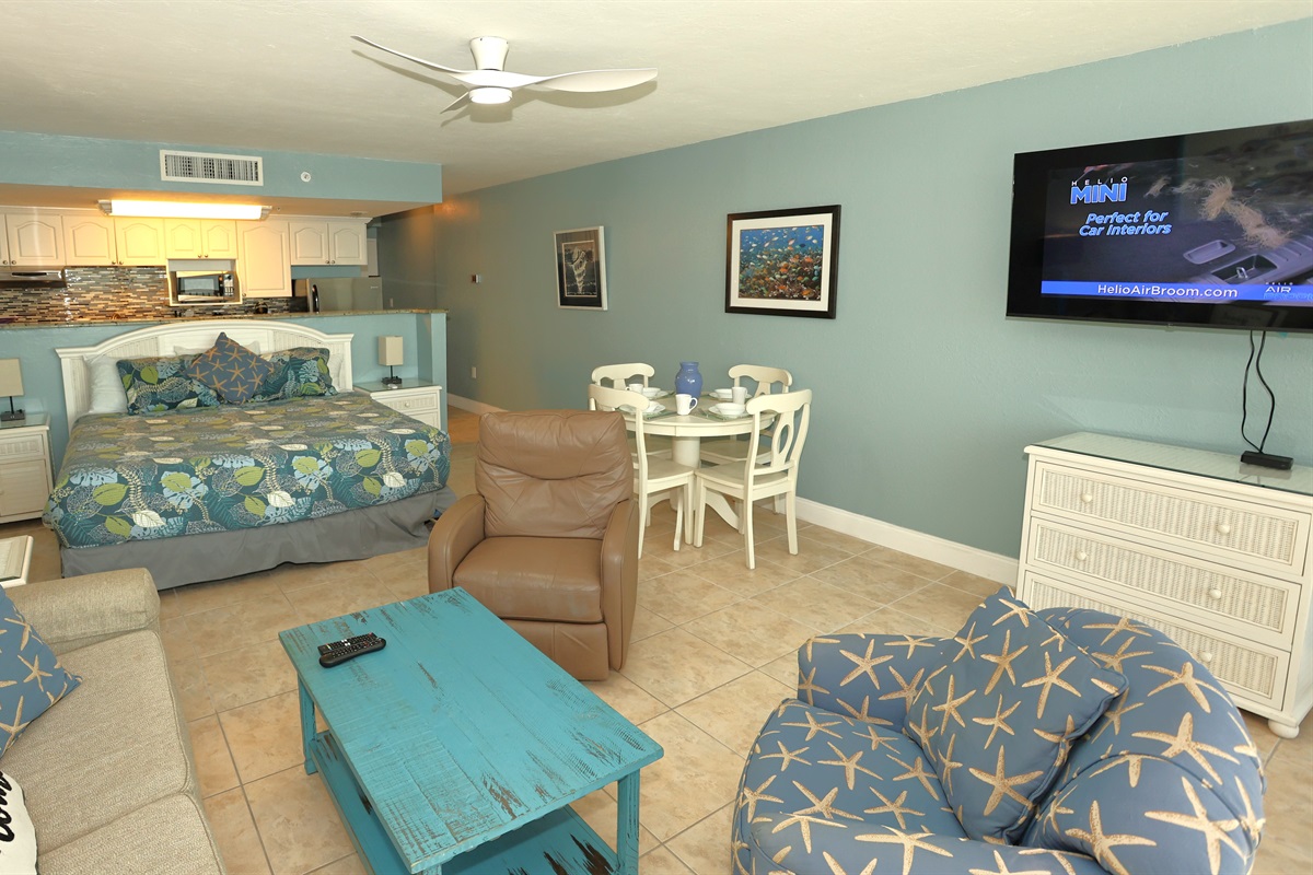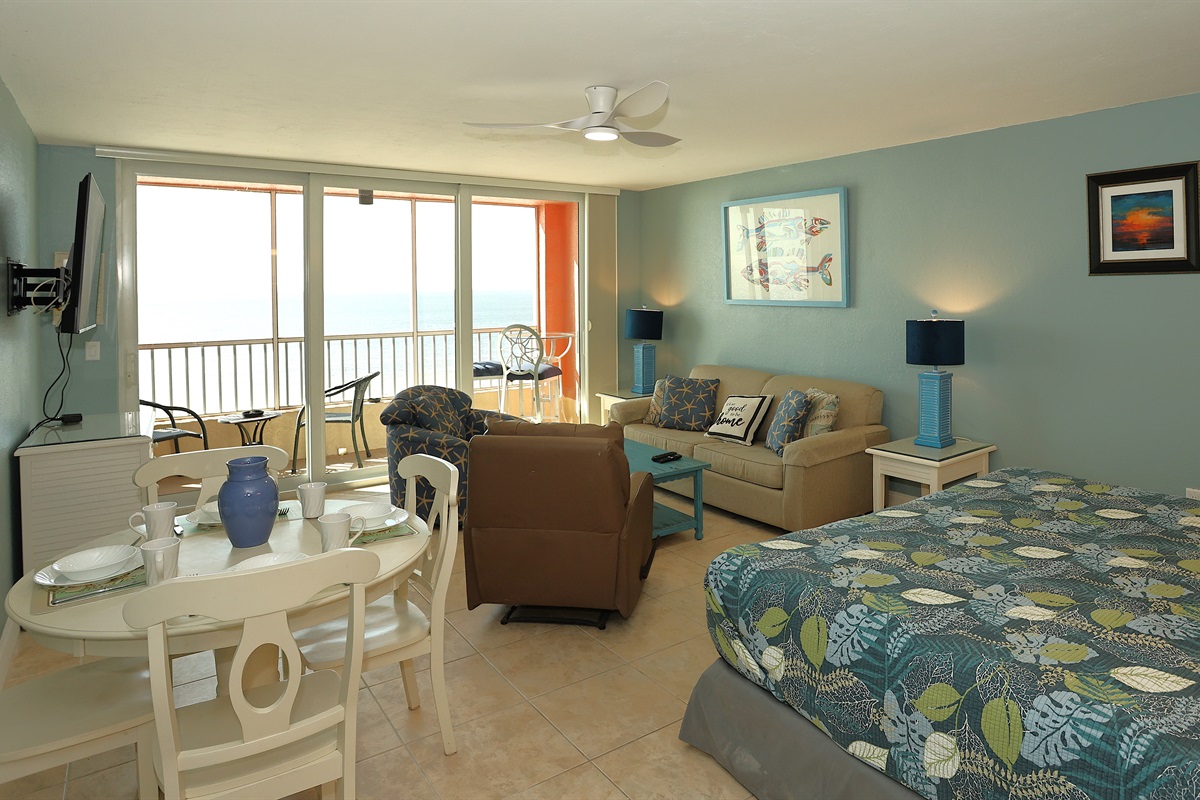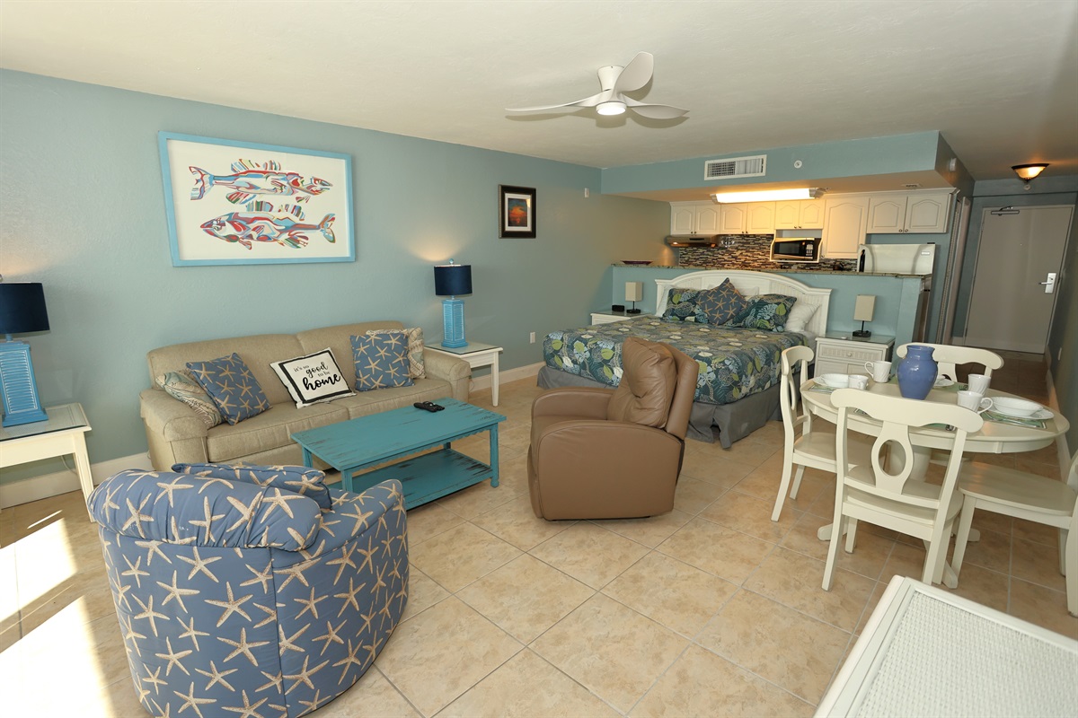 This stunning Gulf-front king suite is the perfect coastal escape, offering breathtaking views of the beach and sea from your private screened balcony. The open-plan layout features a comfortable seating area with plush sofas and ocean-inspired decor, creating a serene and inviting atmosphere. The spacious dining area and stylish furniture make it easy to enjoy meals with family or friends while soaking in the panoramic views.
