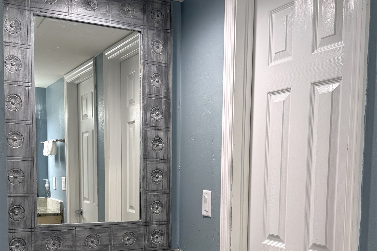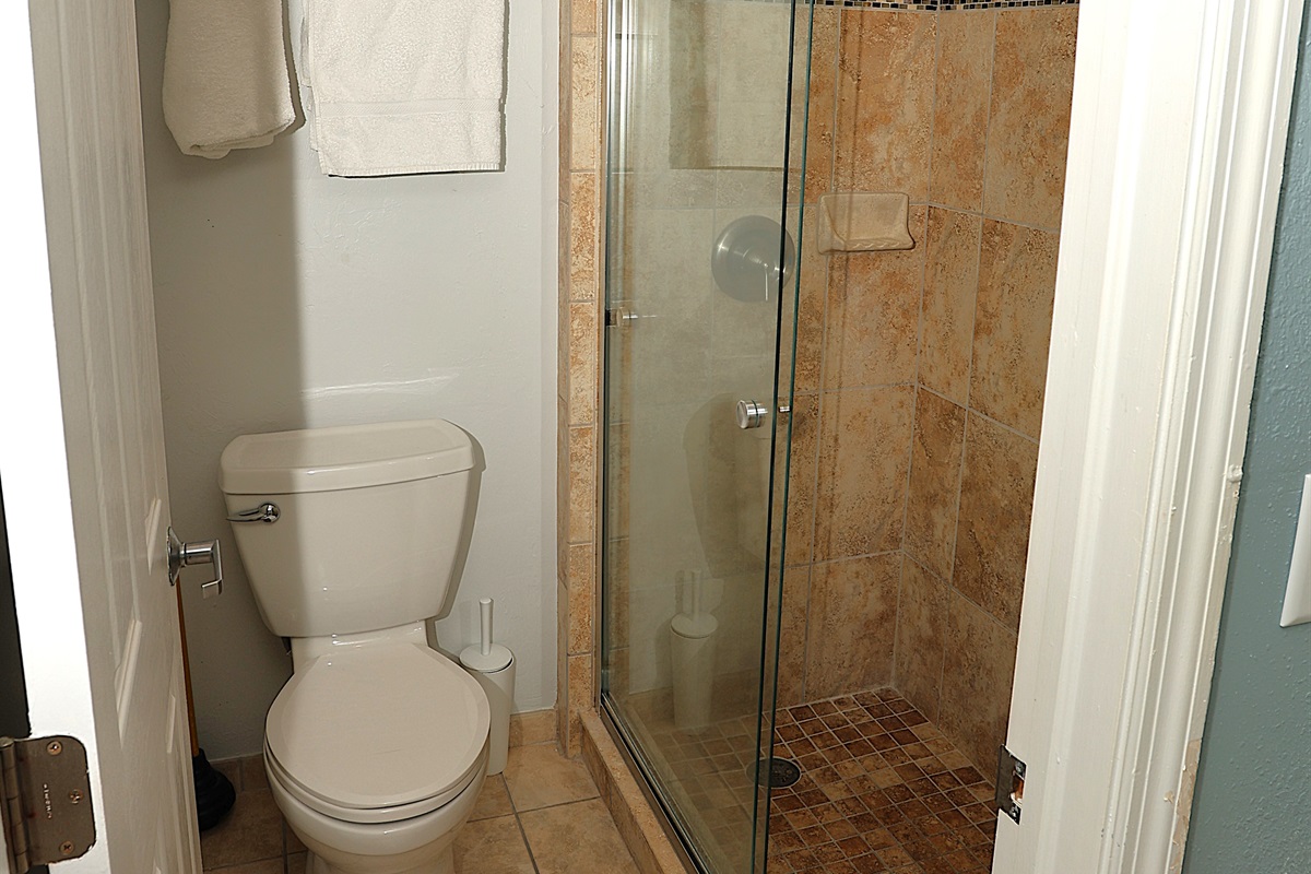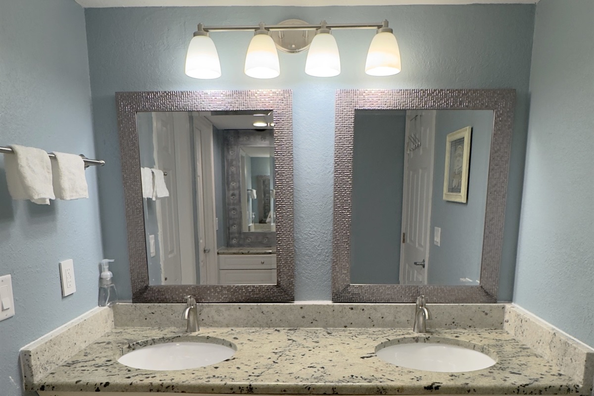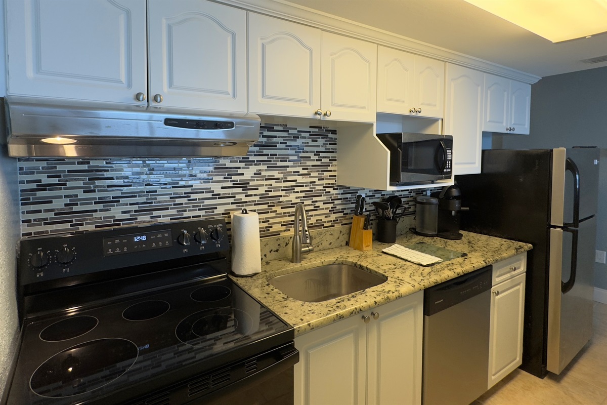 The fully-equipped kitchen boasts granite countertops, modern stainless steel appliances, and a chic mosaic backsplash, ideal for preparing meals during your stay. The king-size bed provides ultimate comfort, while the contemporary bathroom offers dual vanities and a walk-in shower with premium finishes. Thoughtful touches such as vibrant accents and beach-themed artwork enhance the unit's charm and character.