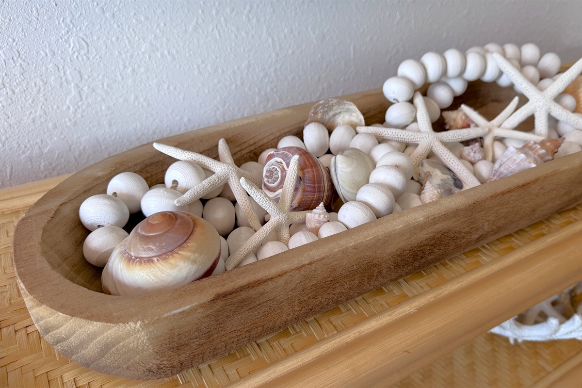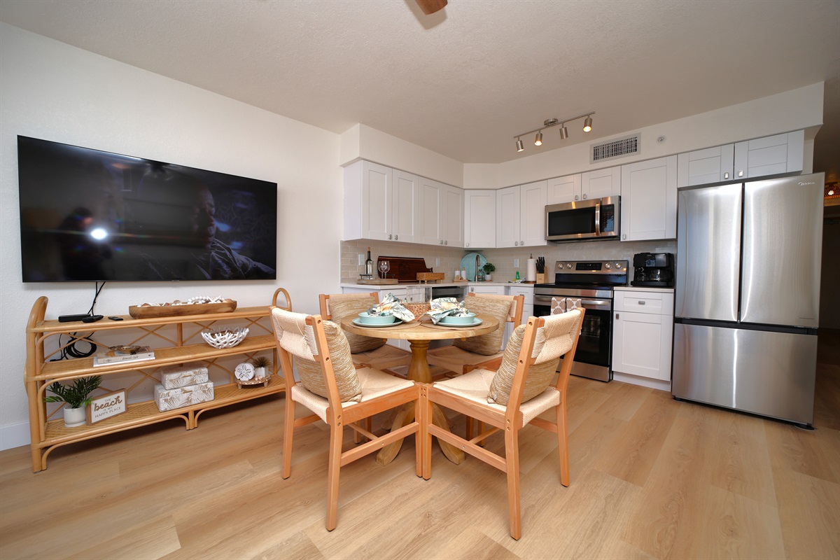 The modern kitchen is designed for both style and functionality, featuring sleek white cabinetry, stainless steel appliances, and elegant countertops. A charming dining area with woven chairs complements the space, providing the perfect spot to enjoy meals while taking in the view. The open layout seamlessly connects the kitchen and living area, creating an inviting atmosphere for entertaining or unwinding after a day at the beach.