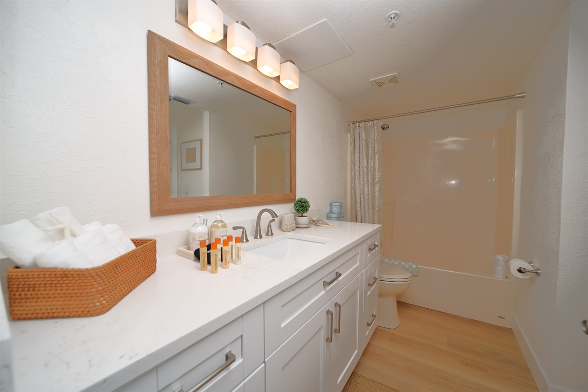 The tranquil bedroom boasts a plush king-sized bed with luxurious linens, a woven headboard, and soft blue accents that enhance the coastal ambiance. The spa-like bathroom features a bright vanity with ample storage, a large mirror, and modern fixtures, creating a refreshing space to start or end the day. This beachfront suite combines elegance and comfort, making it the perfect getaway for those seeking a relaxing escape by the ocean.