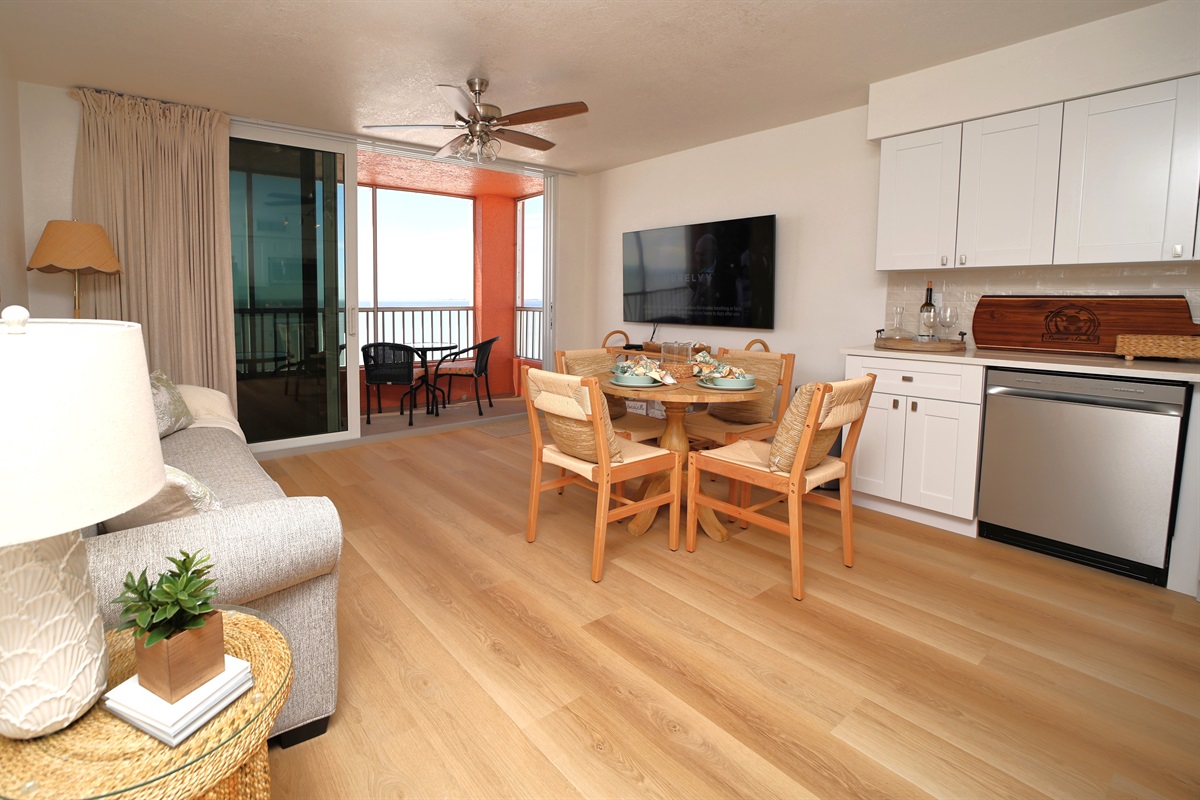 This beautifully renovated beachfront one-bedroom suite at Casa Playa Resort in Fort Myers Beach offers a stylish and comfortable retreat with breathtaking ocean views. The living space is adorned with coastal-inspired decor, featuring a soft neutral color palette, natural wood accents, and a cozy sofa positioned perfectly for relaxation. Large sliding glass doors lead to a private balcony, where guests can enjoy the fresh sea breeze and panoramic views of the Gulf of Mexico.