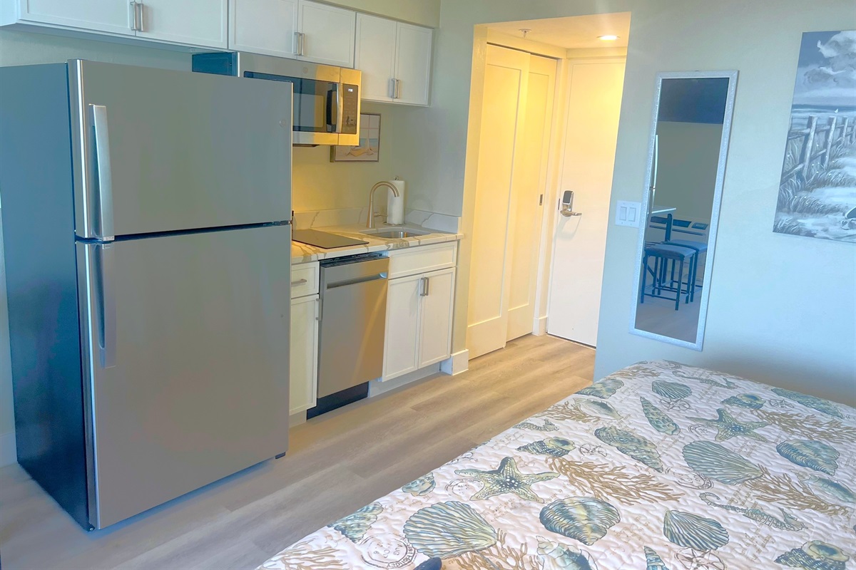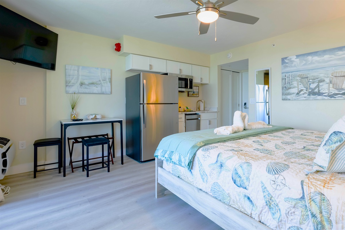 The studio comes equipped with a sleek and modern kitchenette featuring stainless steel appliances, white cabinetry, and a polished quartz countertop. Whether you’re whipping up a quick breakfast or enjoying takeout from one of the local restaurants, you’ll have everything you need right at your fingertips. A small dining nook with stylish seating makes for a cozy spot to enjoy your meals or sip your morning coffee.