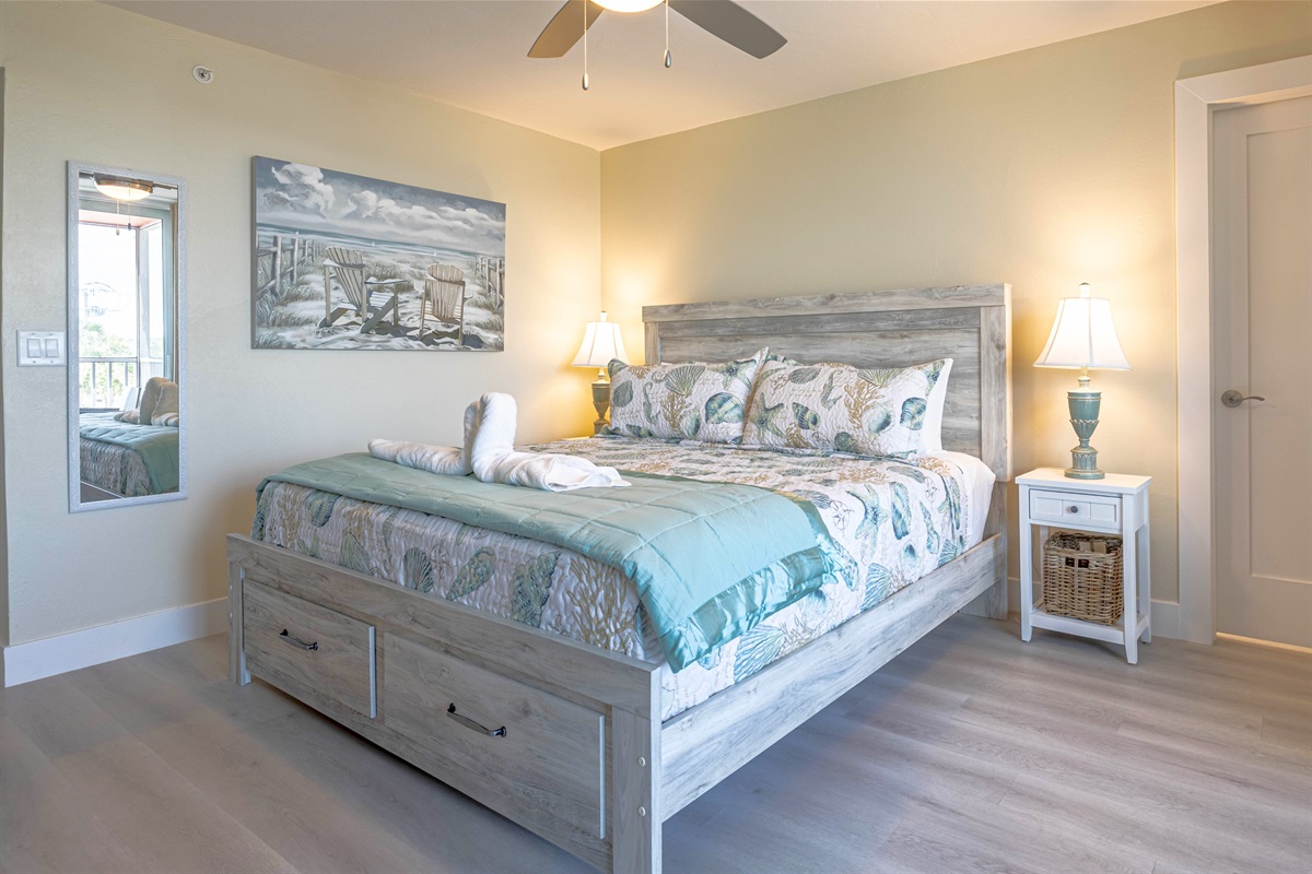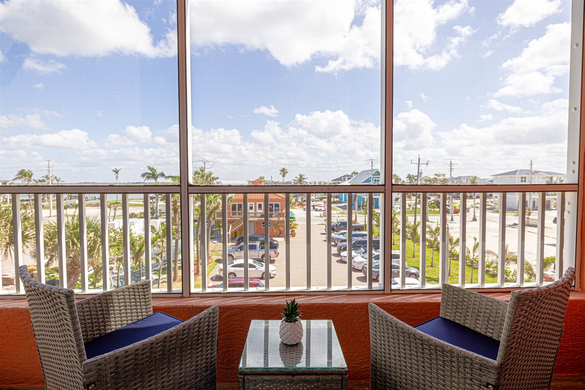 This charming bayview studio at Casa Playa Resort is the perfect spot for a relaxing Fort Myers Beach escape. The bright and inviting space features a king-sized bed with a driftwood-style headboard and soft, shell-patterned bedding that brings a subtle coastal touch to the room. Large glass sliding doors lead out to a private screened balcony where you can unwind and take in the peaceful views of the bay, palm trees, and vibrant island life below.