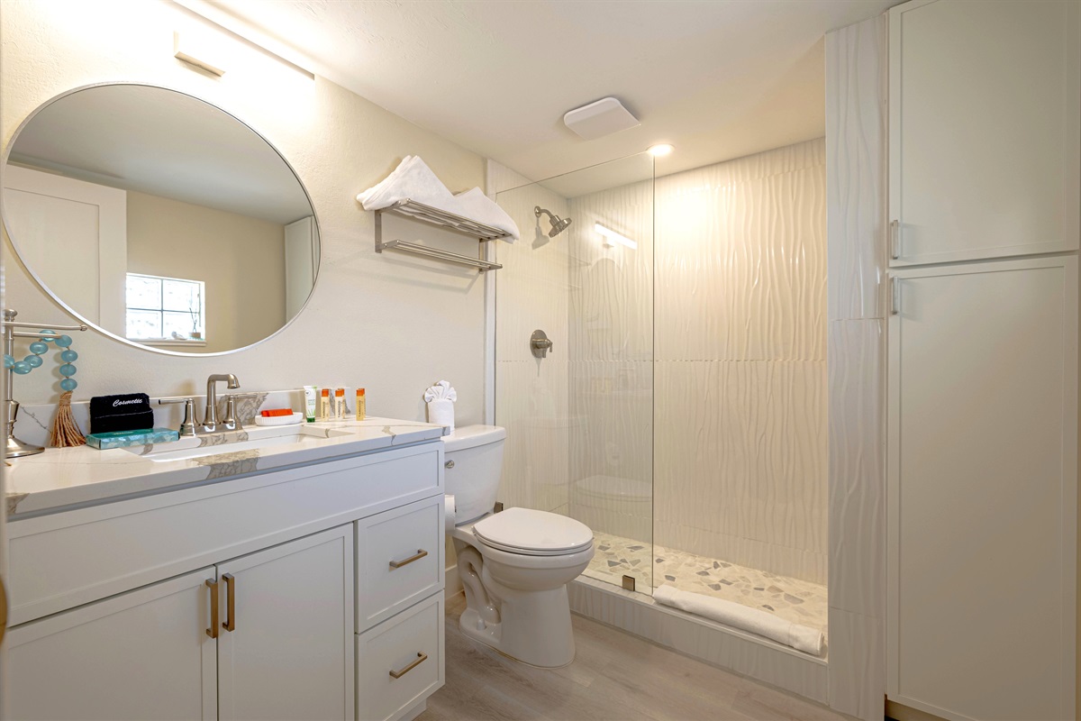 The bathroom is thoughtfully updated with a spacious walk-in shower, tiled with a subtle wave pattern that mirrors the beachy atmosphere of the resort. This bayview studio offers a great balance of comfort and style, with plenty of natural light, fresh coastal decor, and, of course, easy access to all that Casa Playa Resort and Fort Myers Beach have to offer. It’s a perfect choice for couples or solo travelers looking to relax and soak up the Florida sun.