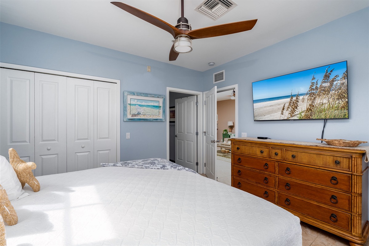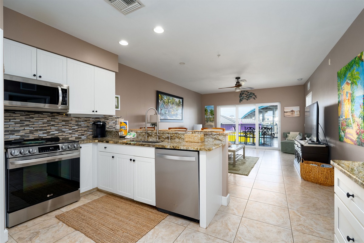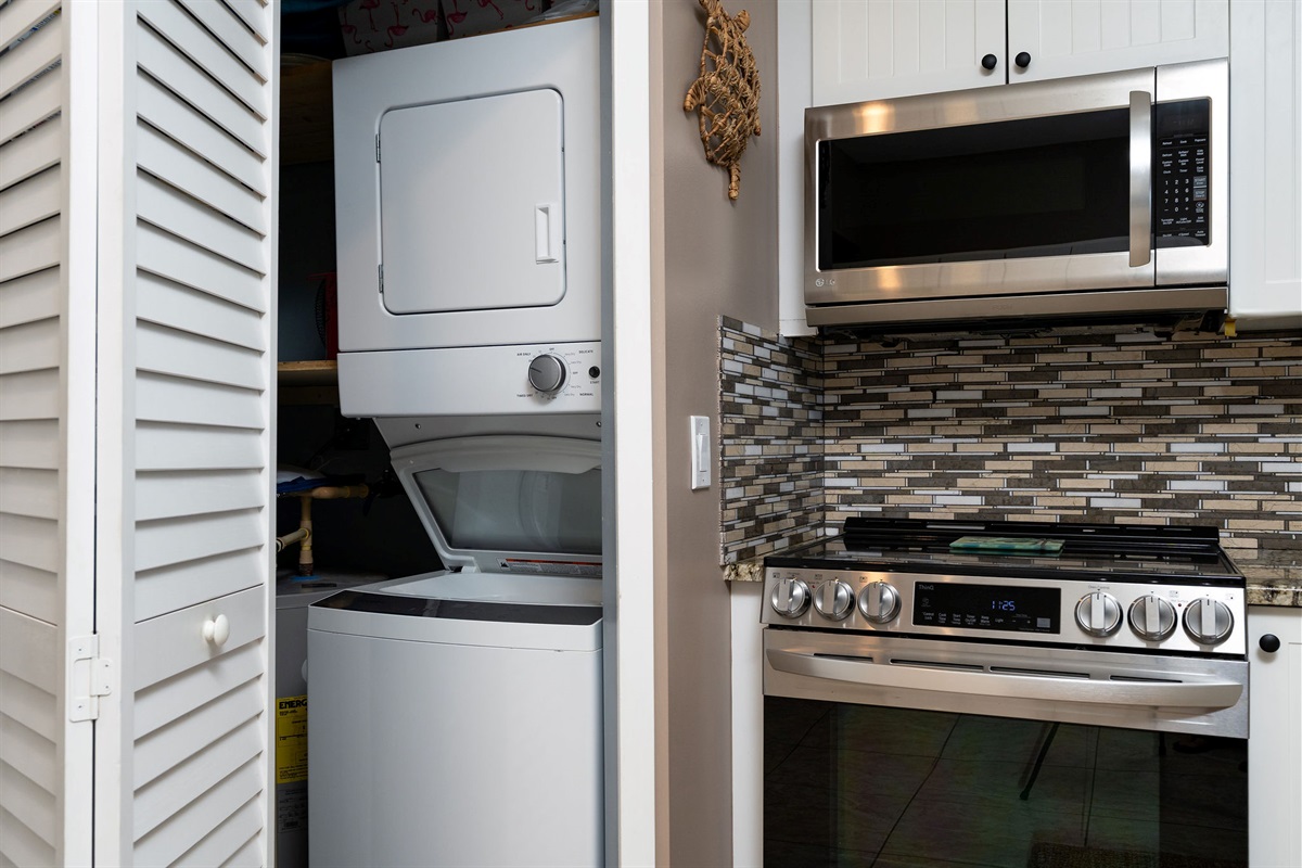 Inside, the unit offers a spacious and inviting layout, ideal for families or small groups. The primary bedroom features a comfortable king-size bed, while the second bedroom includes a cozy queen bed, providing a restful space for everyone. The open living area flows seamlessly into a fully equipped kitchen and dining space, making it easy to gather, relax, and enjoy meals together. Coastal-inspired décor, comfortable furnishings, and plenty of natural light create a warm and welcoming environment throughout. For added convenience, the unit also includes a private washer and dryer, perfect for longer stays.