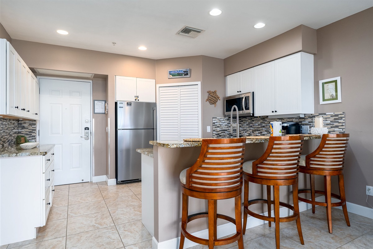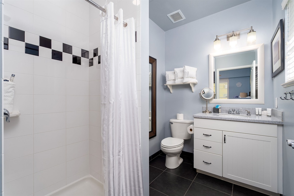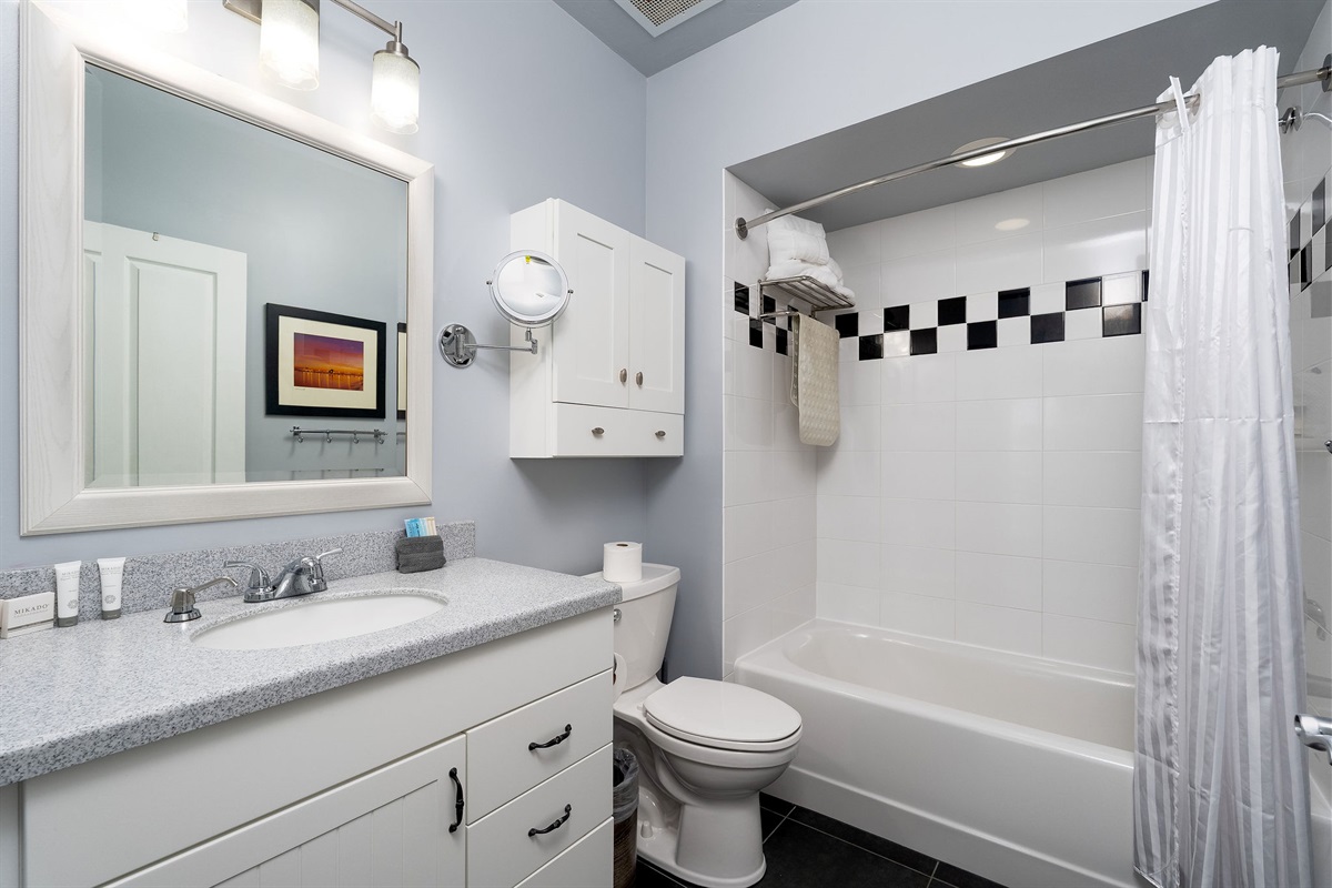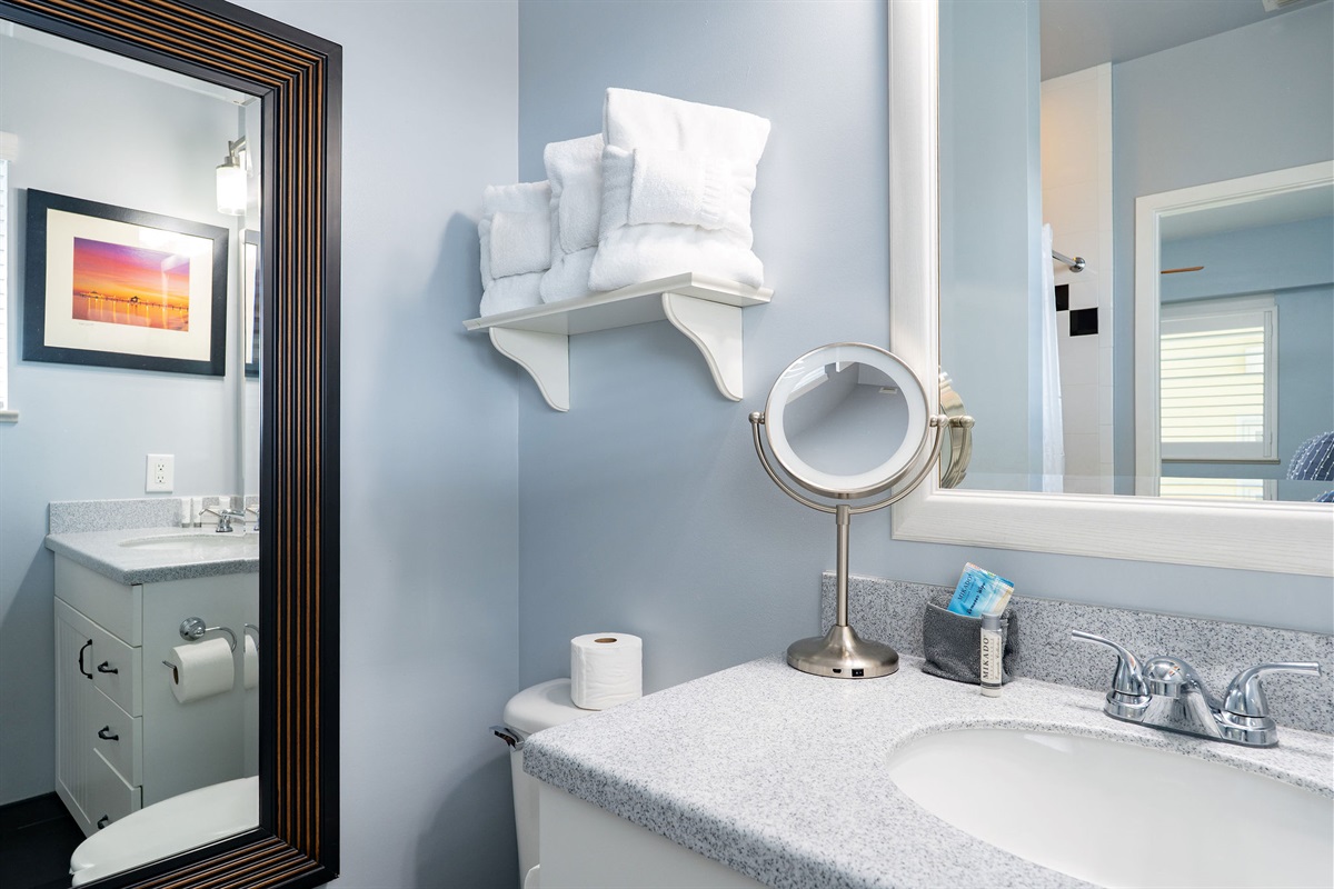 Inside, the unit offers a spacious and inviting layout, ideal for families or small groups. The primary bedroom features a comfortable king-size bed, while the second bedroom includes a cozy queen bed, providing a restful space for everyone. The open living area flows seamlessly into a fully equipped kitchen and dining space, making it easy to gather, relax, and enjoy meals together. Coastal-inspired décor, comfortable furnishings, and plenty of natural light create a warm and welcoming environment throughout. For added convenience, the unit also includes a private washer and dryer, perfect for longer stays.