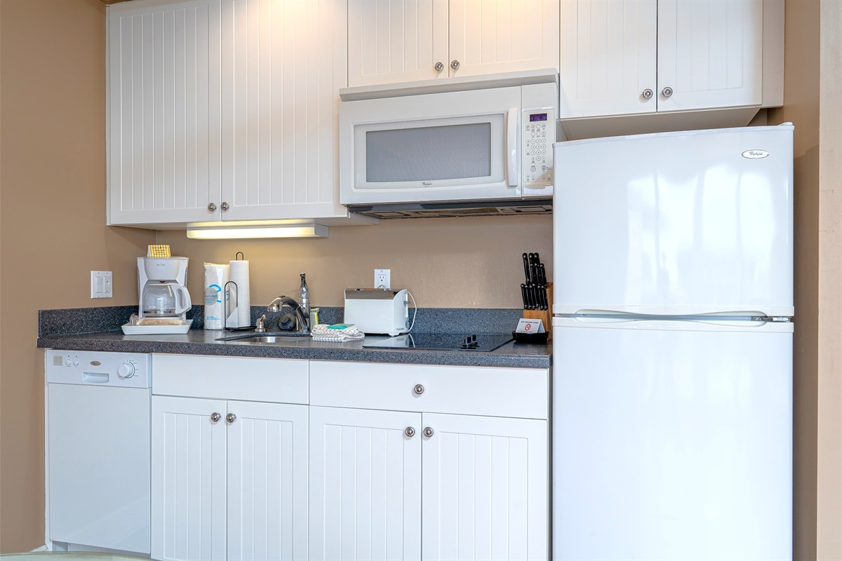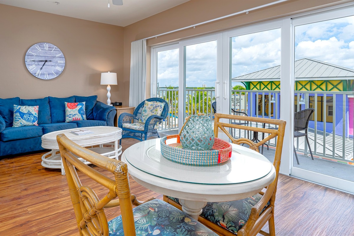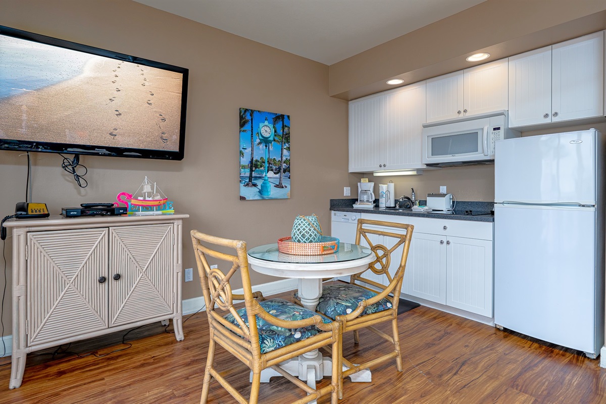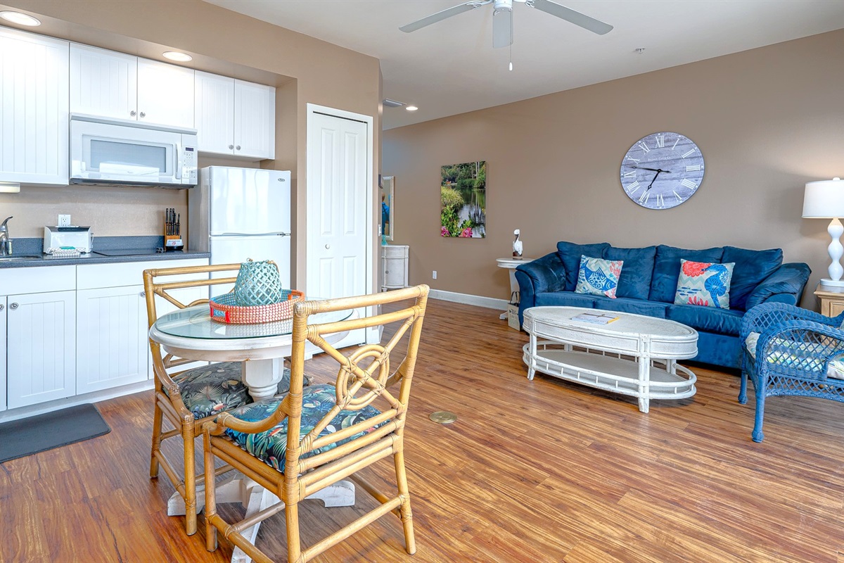 Inside, the unit is thoughtfully designed with both comfort and convenience in mind. The spacious bedroom features a king-size bed, offering a peaceful place to unwind after a day in the sun. The living area includes a sleeper sofa, providing additional sleeping space for guests. A fully equipped kitchen with updated finishes makes it easy to prepare meals or enjoy a quick breakfast before heading out. The open layout, combined with coastal-inspired décor, creates a bright and inviting atmosphere throughout the space.