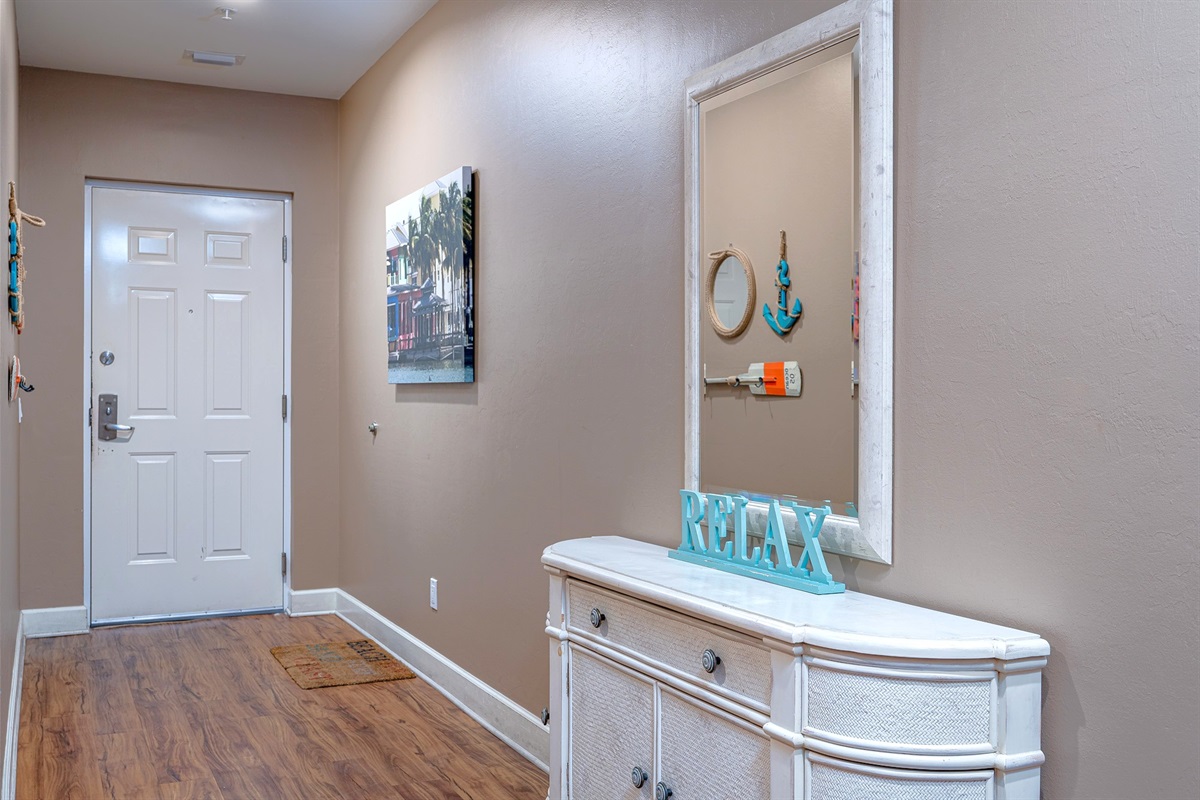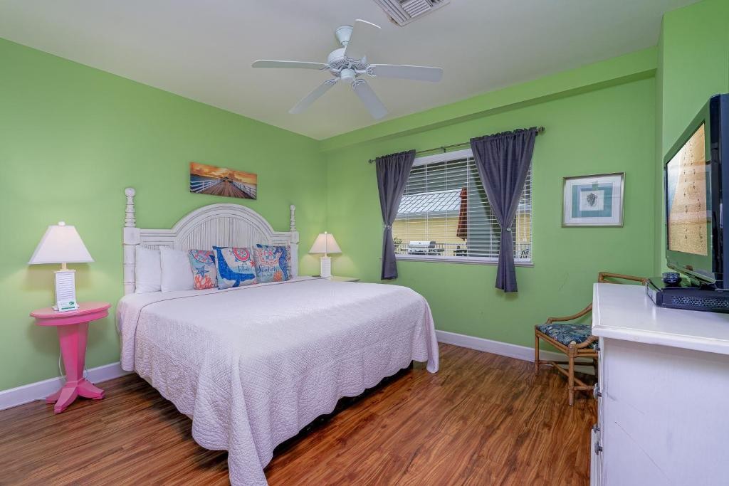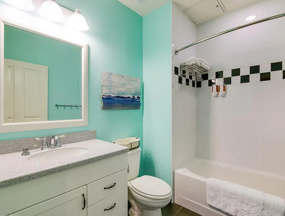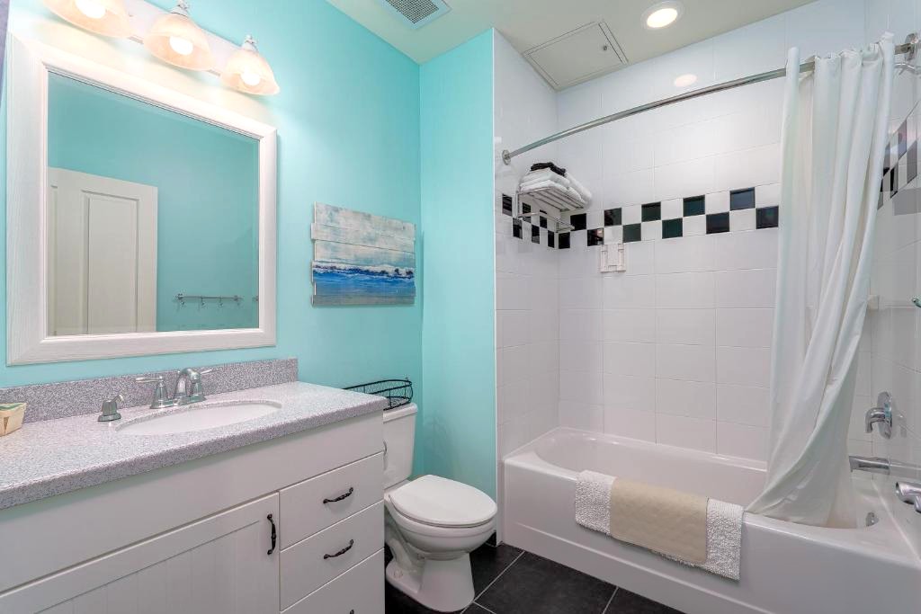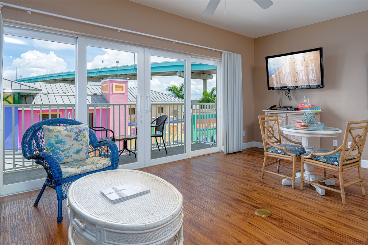 Inside, the unit is thoughtfully designed with both comfort and convenience in mind. The spacious bedroom features a king-size bed, offering a peaceful place to unwind after a day in the sun. The living area includes a sleeper sofa, providing additional sleeping space for guests. A fully equipped kitchen with updated finishes makes it easy to prepare meals or enjoy a quick breakfast before heading out. The open layout, combined with coastal-inspired décor, creates a bright and inviting atmosphere throughout the space.