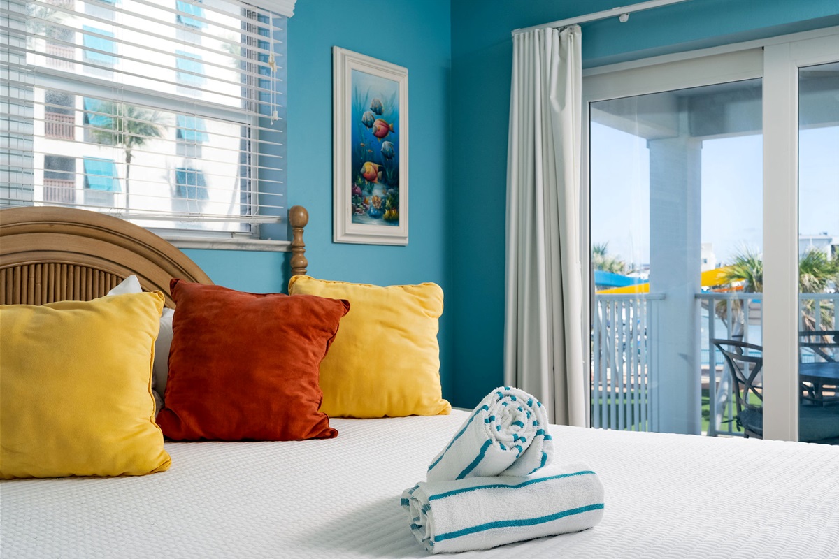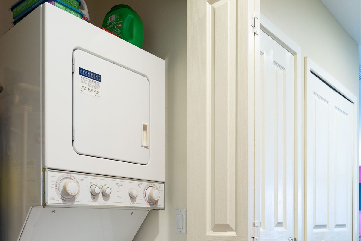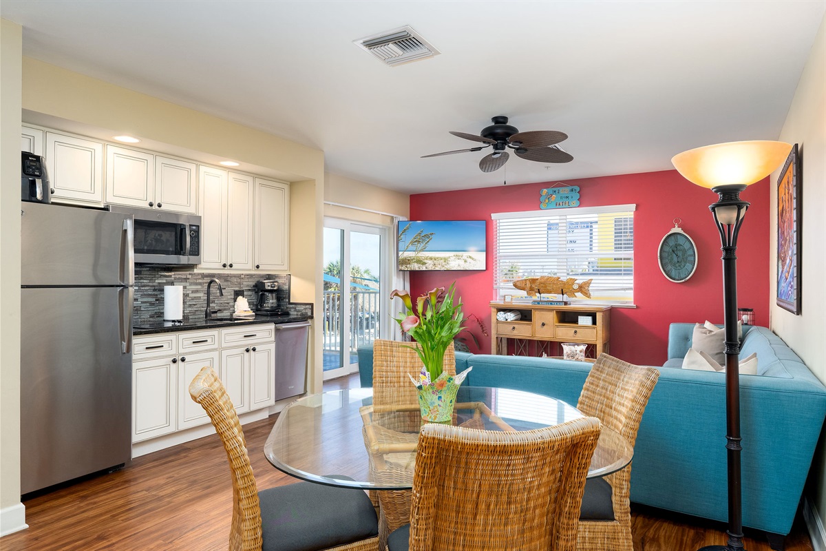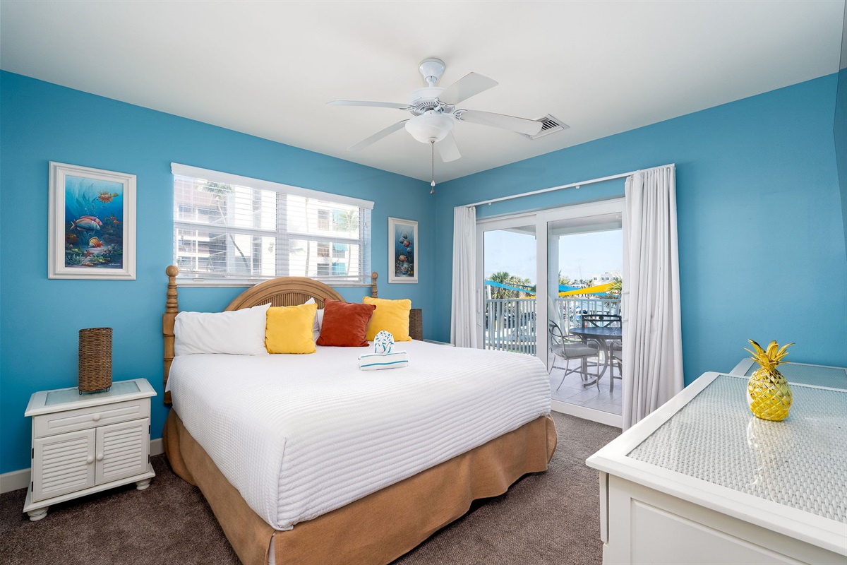 Inside, the unit is thoughtfully designed with comfort and style in mind. The spacious bedroom features a comfortable king-size bed, providing a peaceful place to unwind after a day in the sun. The open living area is bright and welcoming, complemented by a fully equipped kitchen with updated finishes, perfect for preparing meals or enjoying a quick breakfast before heading out. For added convenience, the unit also includes a private washer and dryer, making it ideal for extended stays.