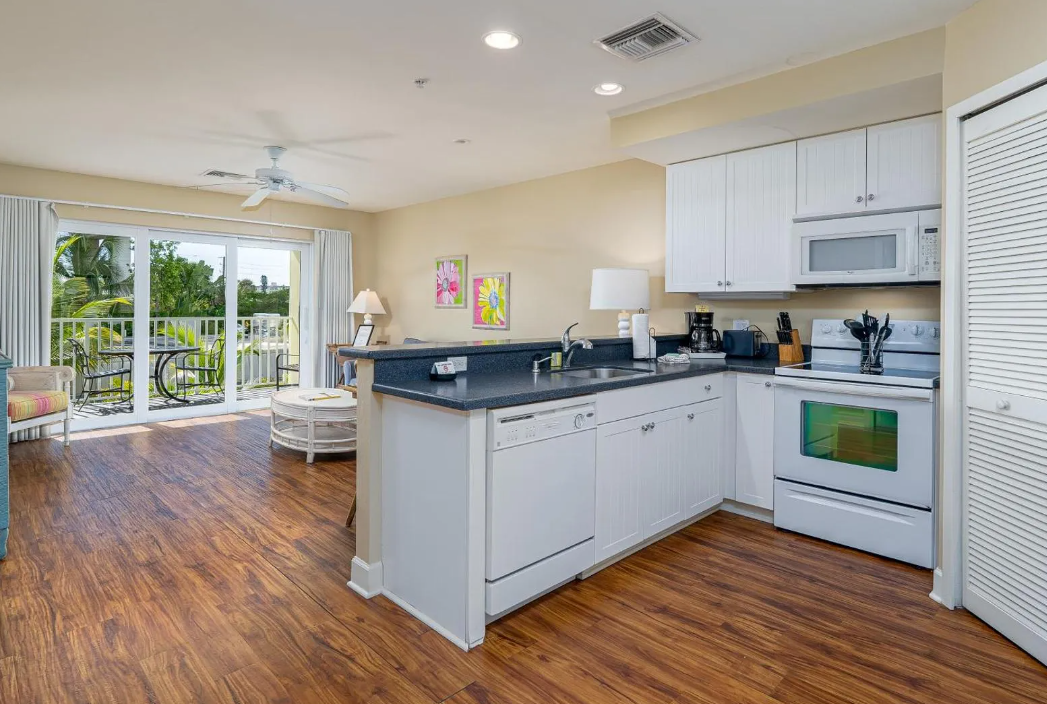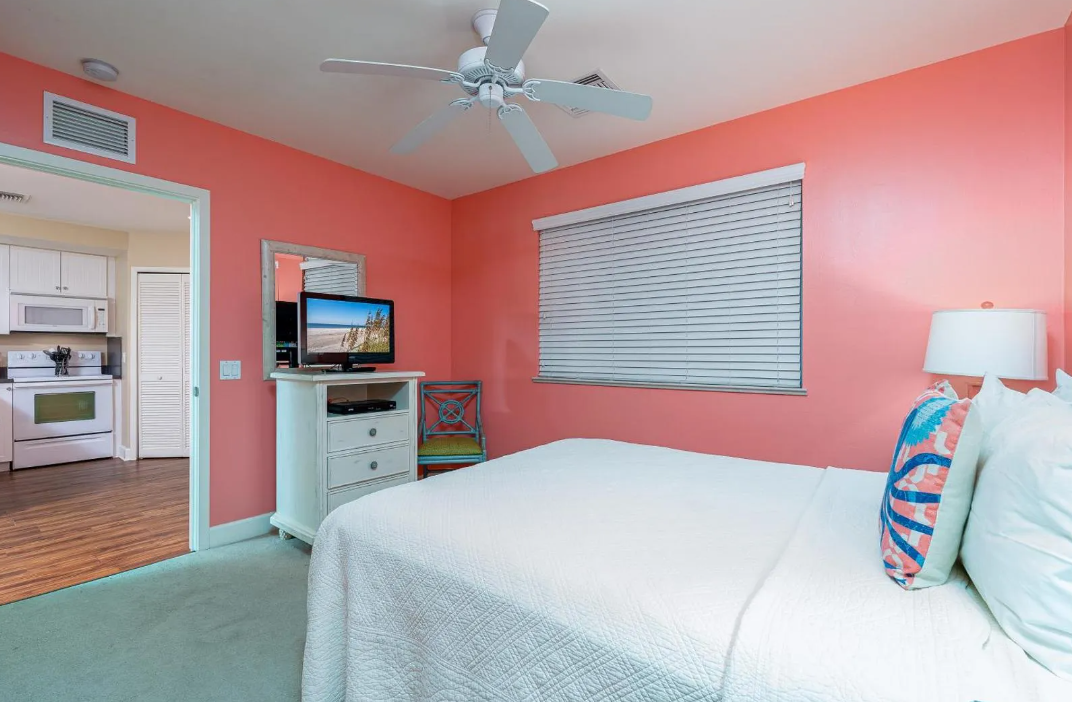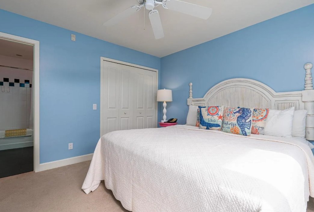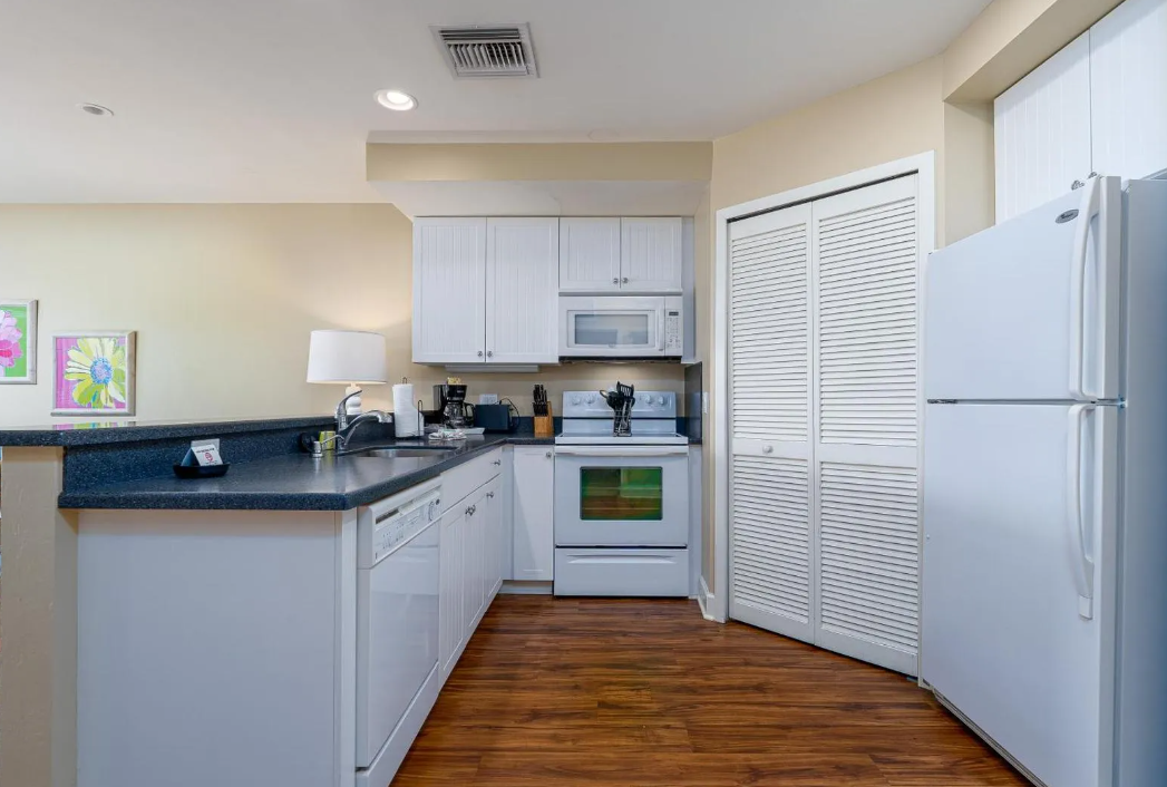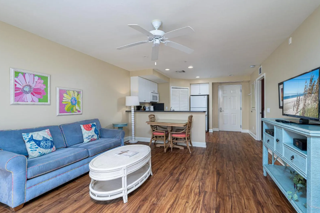 Inside, the unit is thoughtfully designed to provide both comfort and functionality. It features two well-appointed bedrooms and two full bathrooms, making it ideal for families or groups traveling together. The open living area is bright and spacious, seamlessly connecting to a fully equipped kitchen and dining space—perfect for gathering after a day at the beach. Coastal-inspired décor, comfortable furnishings, and plenty of natural light create a warm and inviting environment. For added convenience, the unit also includes a private washer and dryer, making it easy to settle in for longer stays.