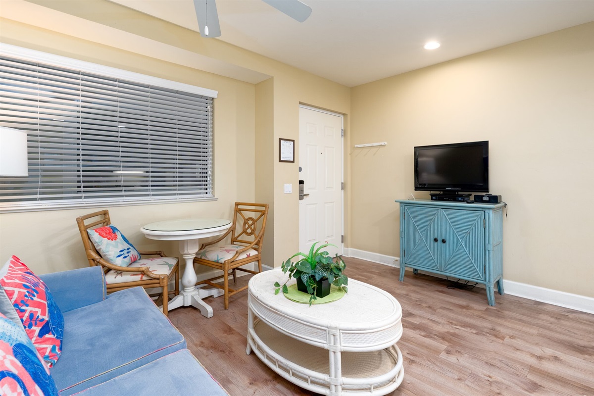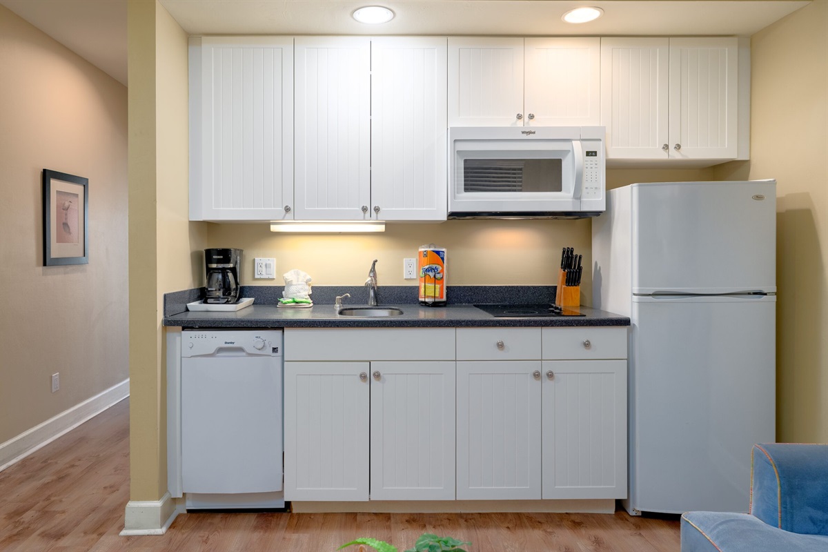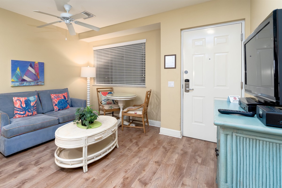 Inside, the unit is thoughtfully designed for both comfort and functionality. The bedroom features a cozy queen-size bed, providing a restful place to unwind after a day at the beach. The living area includes a sleeper sofa, offering additional sleeping space for guests. A fully equipped kitchen with updated finishes makes it easy to prepare meals or enjoy a quick bite before heading out. The open layout and coastal-inspired décor create a bright and inviting atmosphere throughout the space.